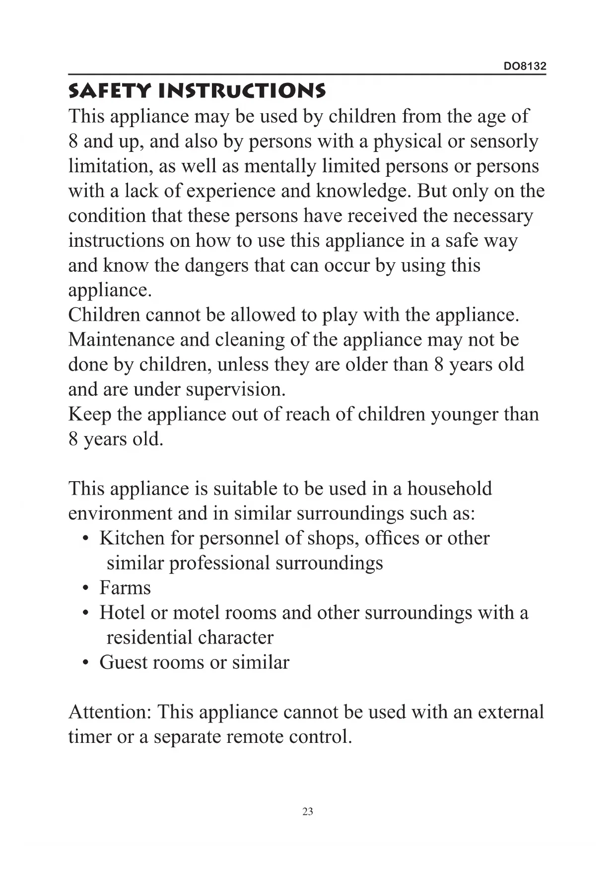 - Guest rooms or similar Attention: This appliance cannot be used with an external timer or a separate remote control.DO8132
