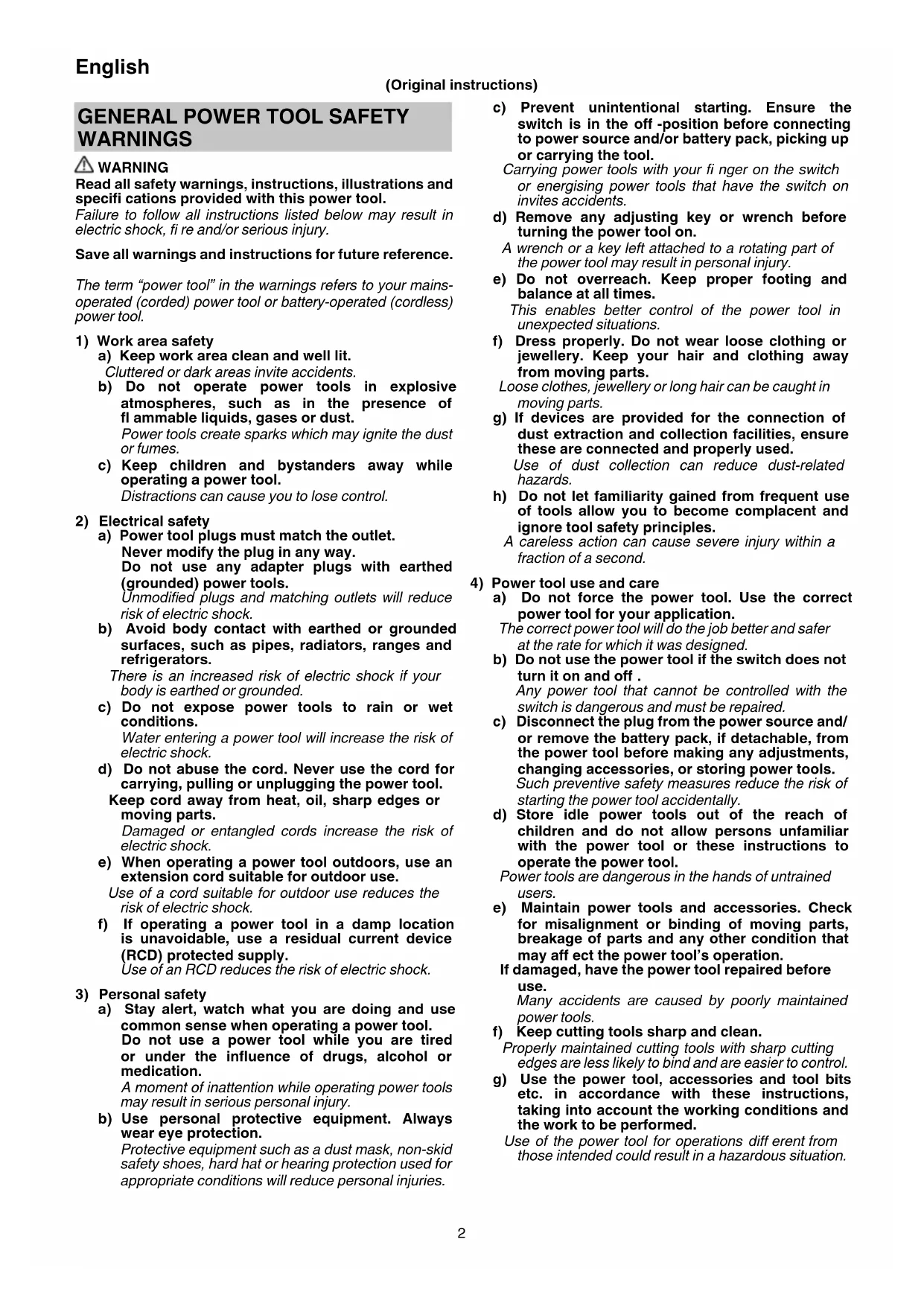 a) Do not force the power tool. Use the correct power tool for your application. The correct power tool will do the job better and safer at the rate for which it was designed. b) Do not use the power tool if the switch does not turn it on and off . Any power tool that cannot be controlled with the switch is dangerous and must be repaired. c) Disconnect the plug from the power source and/ or remove the battery pack, if detachable, from the power tool before making any adjustments, changing accessories, or storing power tools. Such preventive safety measures reduce the risk of starting the power tool accidentally. d) Store idle power tools out of the reach of children and do not allow persons unfamiliar with the power tool or these instructions to operate the power tool. Power tools are dangerous in the hands of untrained users. e) Maintain power tools and accessories. Check for misalignment or binding of moving parts, breakage of parts and any other condition that may aff ect the power tool’s operation. If damaged, have the power tool repaired before use. Many accidents are caused by poorly maintained power tools. f) Keep cutting tools sharp and clean. Properly maintained cutting tools with sharp cutting edges are less likely to bind and are easier to control. g) Use the power tool, accessories and tool bits etc. in accordance with these instructions, taking into account the working conditions and the work to be performed. Use of the power tool for operations diff erent from those intended could result in a hazardous situation.