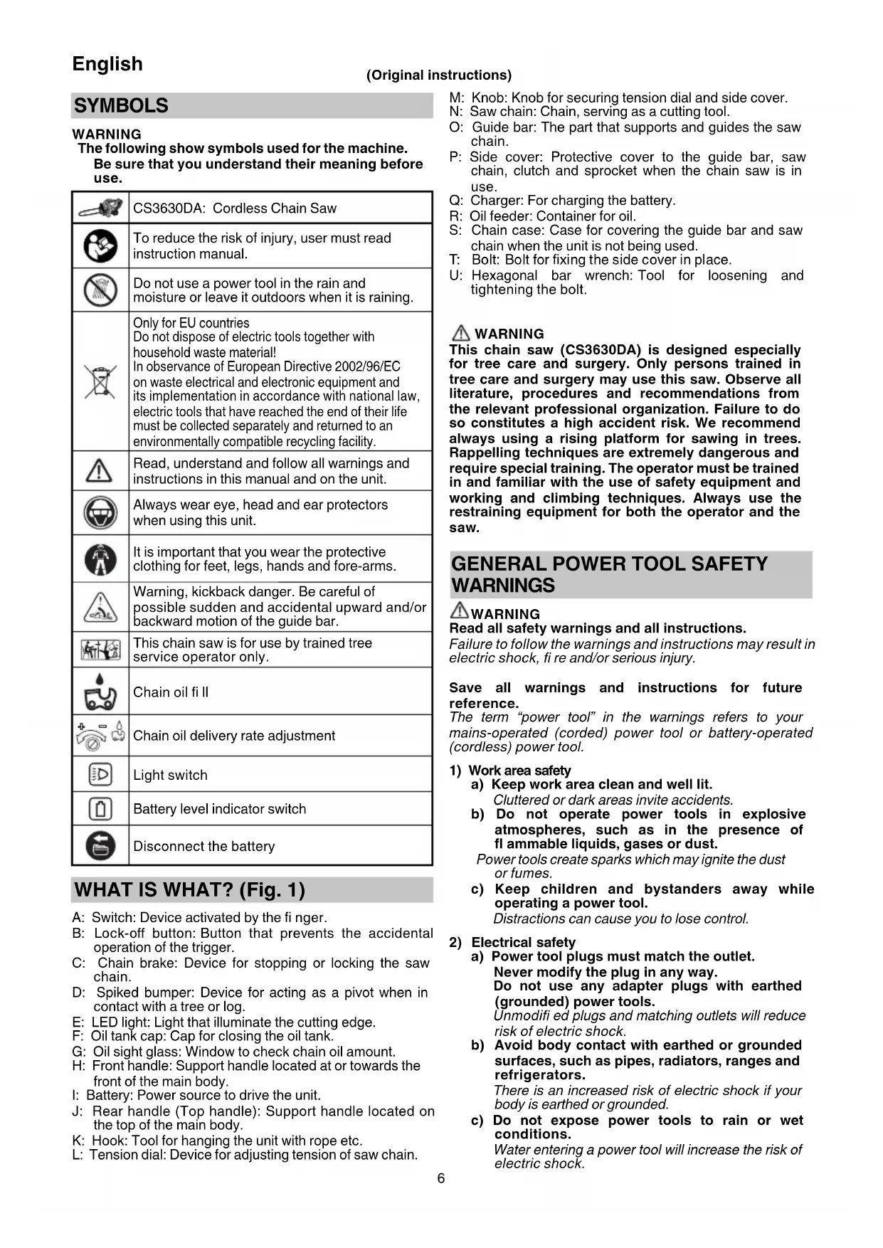 000BookCS3630DA.indb5000BookCS3630DA.indb5 2019/07/2917:49:362019/07/2917:49:366 English (Original instructions) SYMBOLS WARNING The following show symbols used for the machine. Be sure that you understand their meaning before use. CS3630DA: Cordless Chain Saw To reduce the risk of injury, user must read instruction manual. Do not use a power tool in the rain and moisture or leave it outdoors when it is raining. Only for EU countries Do not dispose of electric tools together with household waste material! In observance of European Directive 2002/96/EC on waste electrical and electronic equipment and its implementation in accordance with national law, electric tools that have reached the end of their life must be collected separately and returned to an environmentally compatible recycling facility. Read, understand and follow all warnings and instructions in this manual and on the unit. Always wear eye, head and ear protectors when using this unit. It is important that you wear the protective clothing for feet, legs, hands and fore-arms. Warning, kickback danger. Be careful of possible sudden and accidental upward and/or backward motion of the guide bar. This chain saw is for use by trained tree service operator only. Chain oil fi ll Chain oil delivery rate adjustment Light switch Battery level indicator switch Disconnect the battery WHAT IS WHAT? (Fig. 1) A: Switch: Device activated by the fi nger. B: Lock-off button: Button that prevents the accidental operation of the trigger. C: Chain brake: Device for stopping or locking the saw chain. D: Spiked bumper: Device for acting as a pivot when in contact with a tree or log. E: LED light: Light that illuminate the cutting edge. F: Oil tank cap: Cap for closing the oil tank. G: Oil sight glass: Window to check chain oil amount. H: Front handle: Support handle located at or towards the front of the main body. I: Battery: Power source to drive the unit. J: Rear handle (Top handle): Support handle located on the top of the main body. K: Hook: Tool for hanging the unit with rope etc. L: Tension dial: Device for adjusting tension of saw chain. M: Knob: Knob for securing tension dial and side cover. N: Saw chain: Chain, serving as a cutting tool. O: Guide bar: The part that supports and guides the saw chain. P: Side cover: Protective cover to the guide bar, saw chain, clutch and sprocket when the chain saw is in use. Q: Charger: For charging the battery. R: Oil feeder: Container for oil. S: Chain case: Case for covering the guide bar and saw chain when the unit is not being used. T: Bolt: Bolt for fi xing the side cover in place. U: Hexagonal bar wrench: Tool for loosening and tightening the bolt. WARNING This chain saw (CS3630DA) is designed especially for tree care and surgery. Only persons trained in tree care and surgery may use this saw. Observe all literature, procedures and recommendations from the relevant professional organization. Failure to do so constitutes a high accident risk. We recommend always using a rising platform for sawing in trees. Rappelling techniques are extremely dangerous and require special training. The operator must be trained in and familiar with the use of safety equipment and working and climbing techniques. Always use the restraining equipment for both the operator and the saw.