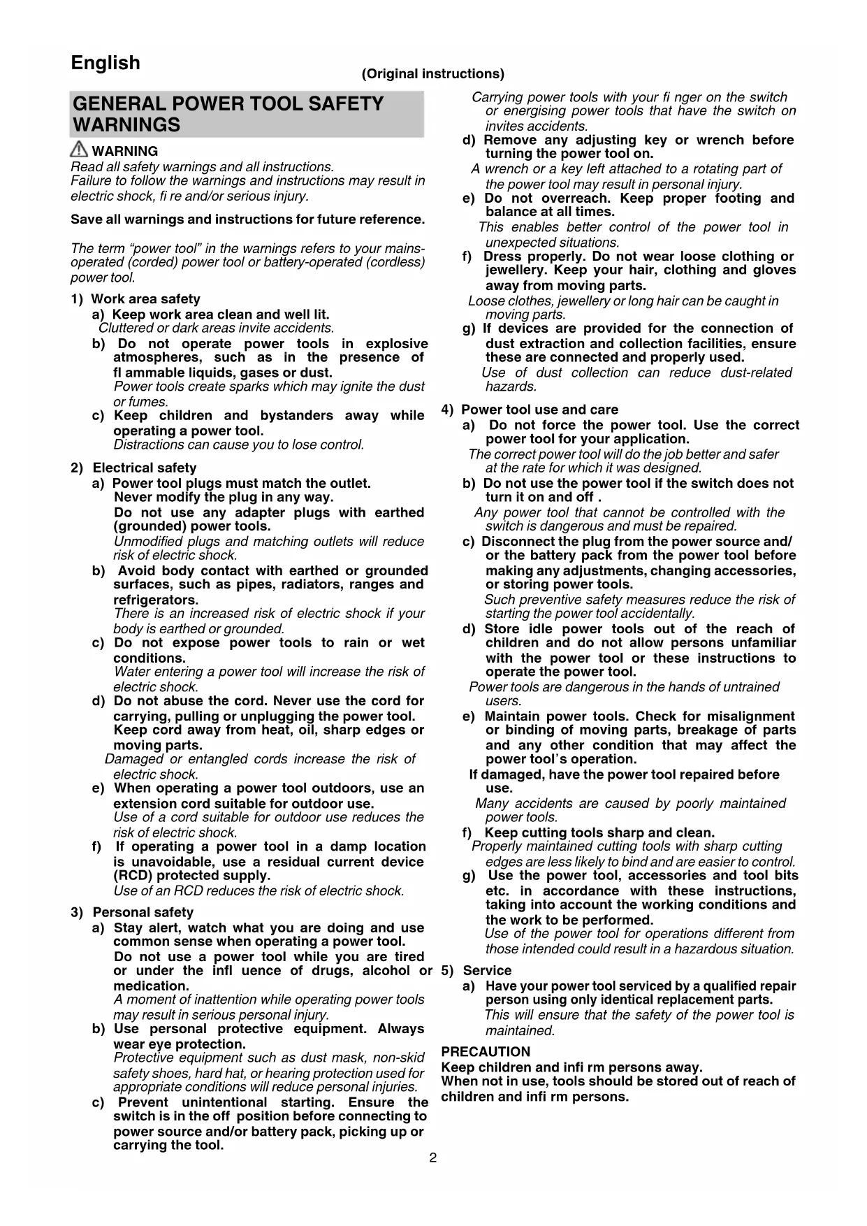 f) If operating a power tool in a damp location is unavoidable, use a residual current device (RCD) protected supply. Use of an RCD reduces the risk of electric shock.