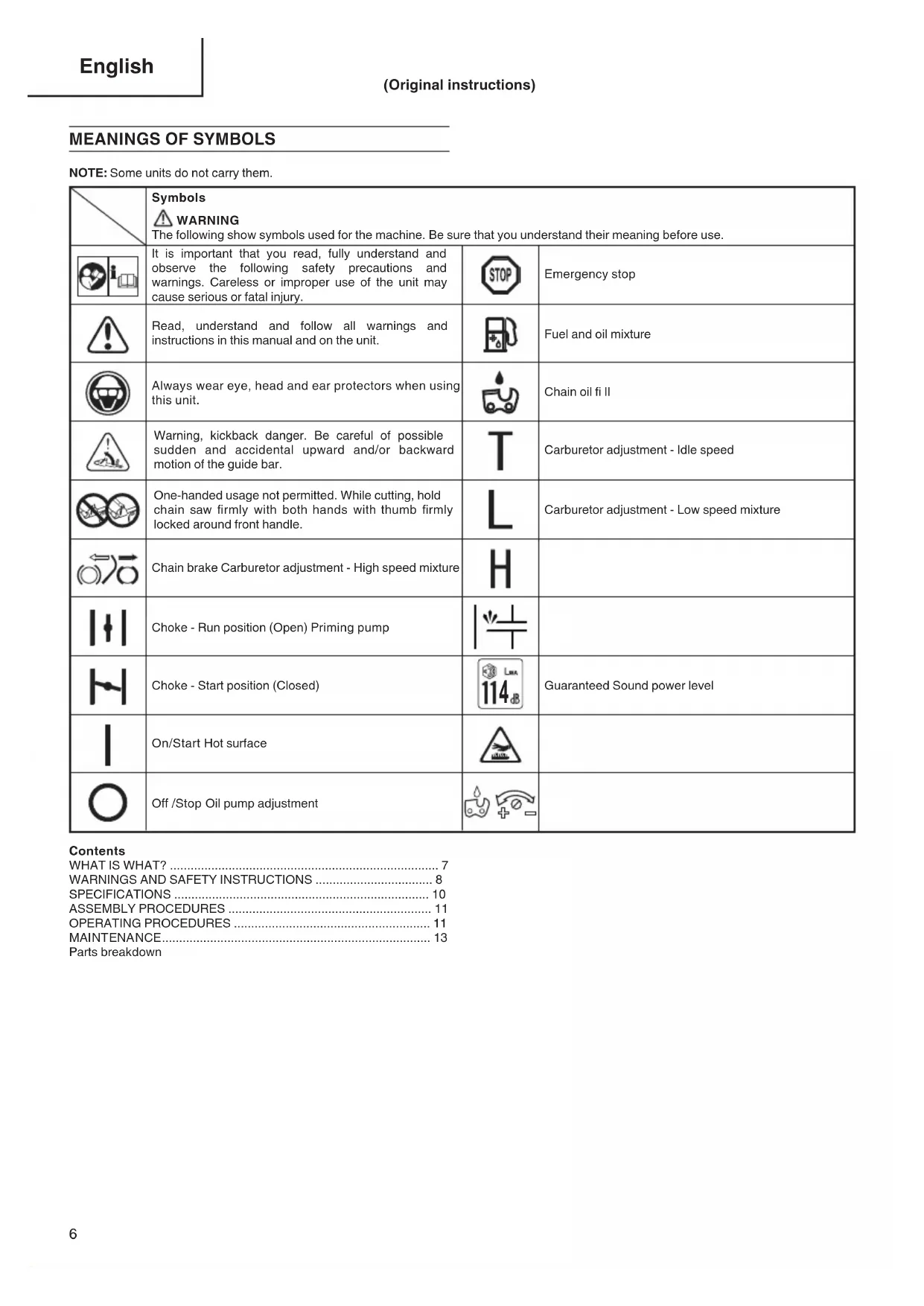 NOTE: Some units do not carry them. Symbols WARNING The following show symbols used for the machine. Be sure that you understand their meaning before use. It is important that you read, fully understand and observe the following safety precautions and warnings. Careless or improper use of the unit may cause serious or fatal injury. Emergency stop Read, understand and follow all warnings and instructions in this manual and on the unit. Fuel and oil mixture Always wear eye, head and ear protectors when using this unit. Chain oil fi ll Warning, kickback danger. Be careful of possible sudden and accidental upward and/or backward motion of the guide bar. Carburetor adjustment - Idle speed One-handed usage not permitted. While cutting, hold chain saw fi rmly with both hands with thumb fi rmly locked around front handle. Carburetor adjustment - Low speed mixture Chain brake Carburetor adjustment - High speed mixture Choke - Run position (Open) Priming pump Choke - Start position (Closed)
