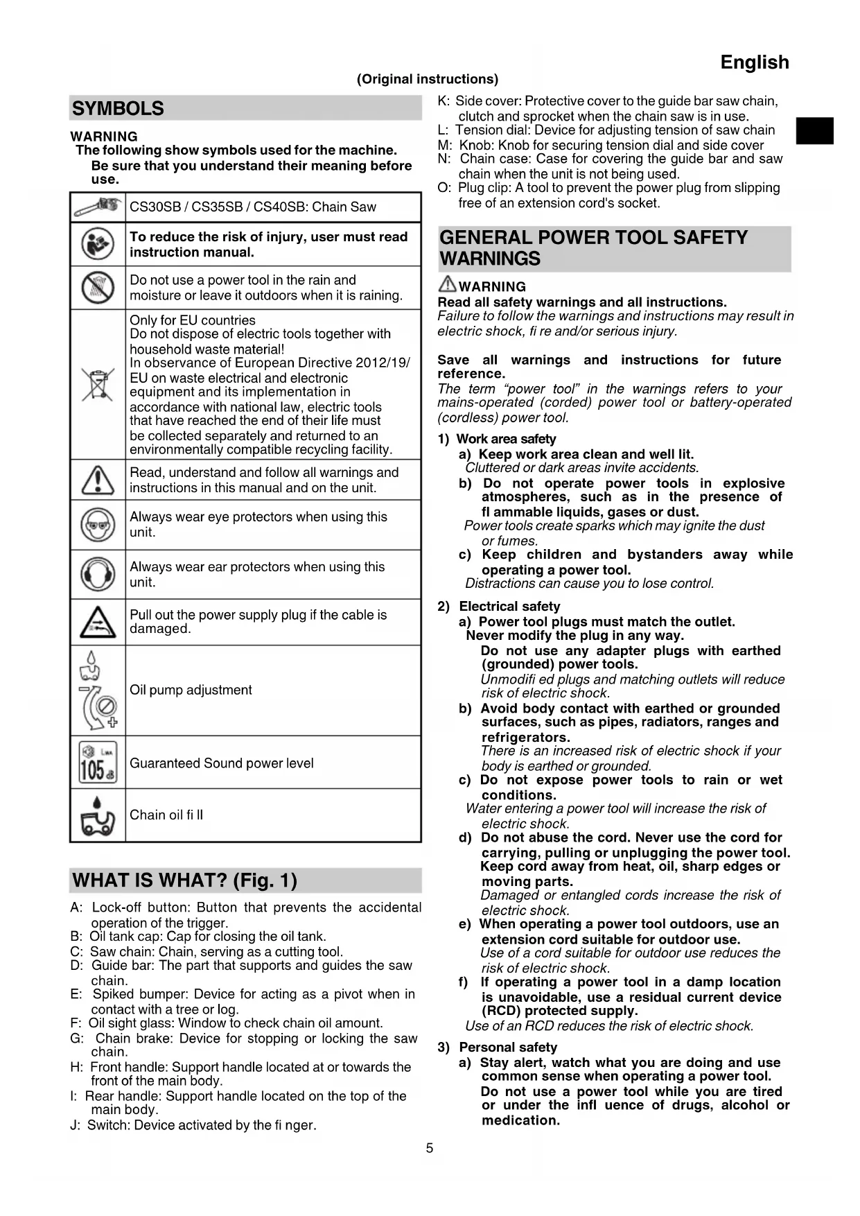 0000BookCS30SB.indb40000BookCS30SB.indb4 2019/06/1410:09:212019/06/1410:09:215 English (Original instructions) SYMBOLS WARNING The following show symbols used for the machine. Be sure that you understand their meaning before use. CS30SB / CS35SB / CS40SB: Chain Saw To reduce the risk of injury, user must read instruction manual. Do not use a power tool in the rain and moisture or leave it outdoors when it is raining. Only for EU countries Do not dispose of electric tools together with household waste material! In observance of European Directive 2012/19/ EU on waste electrical and electronic equipment and its implementation in accordance with national law, electric tools that have reached the end of their life must be collected separately and returned to an environmentally compatible recycling facility. Read, understand and follow all warnings and instructions in this manual and on the unit. Always wear eye protectors when using this unit. Always wear ear protectors when using this unit. Pull out the power supply plug if the cable is damaged. Oil pump adjustment Guaranteed Sound power level Chain oil fi ll WHAT IS WHAT? (Fig. 1) A: Lock-off button: Button that prevents the accidental operation of the trigger. B: Oil tank cap: Cap for closing the oil tank. C: Saw chain: Chain, serving as a cutting tool. D: Guide bar: The part that supports and guides the saw chain. E: Spiked bumper: Device for acting as a pivot when in contact with a tree or log. F: Oil sight glass: Window to check chain oil amount. G: Chain brake: Device for stopping or locking the saw chain. H: Front handle: Support handle located at or towards the front of the main body. I: Rear handle: Support handle located on the top of the main body. J: Switch: Device activated by the fi nger. K: Side cover: Protective cover to the guide bar saw chain, clutch and sprocket when the chain saw is in use. L: Tension dial: Device for adjusting tension of saw chain M: Knob: Knob for securing tension dial and side cover N: Chain case: Case for covering the guide bar and saw chain when the unit is not being used. O: Plug clip: A tool to prevent the power plug from slipping free of an extension cord's socket.