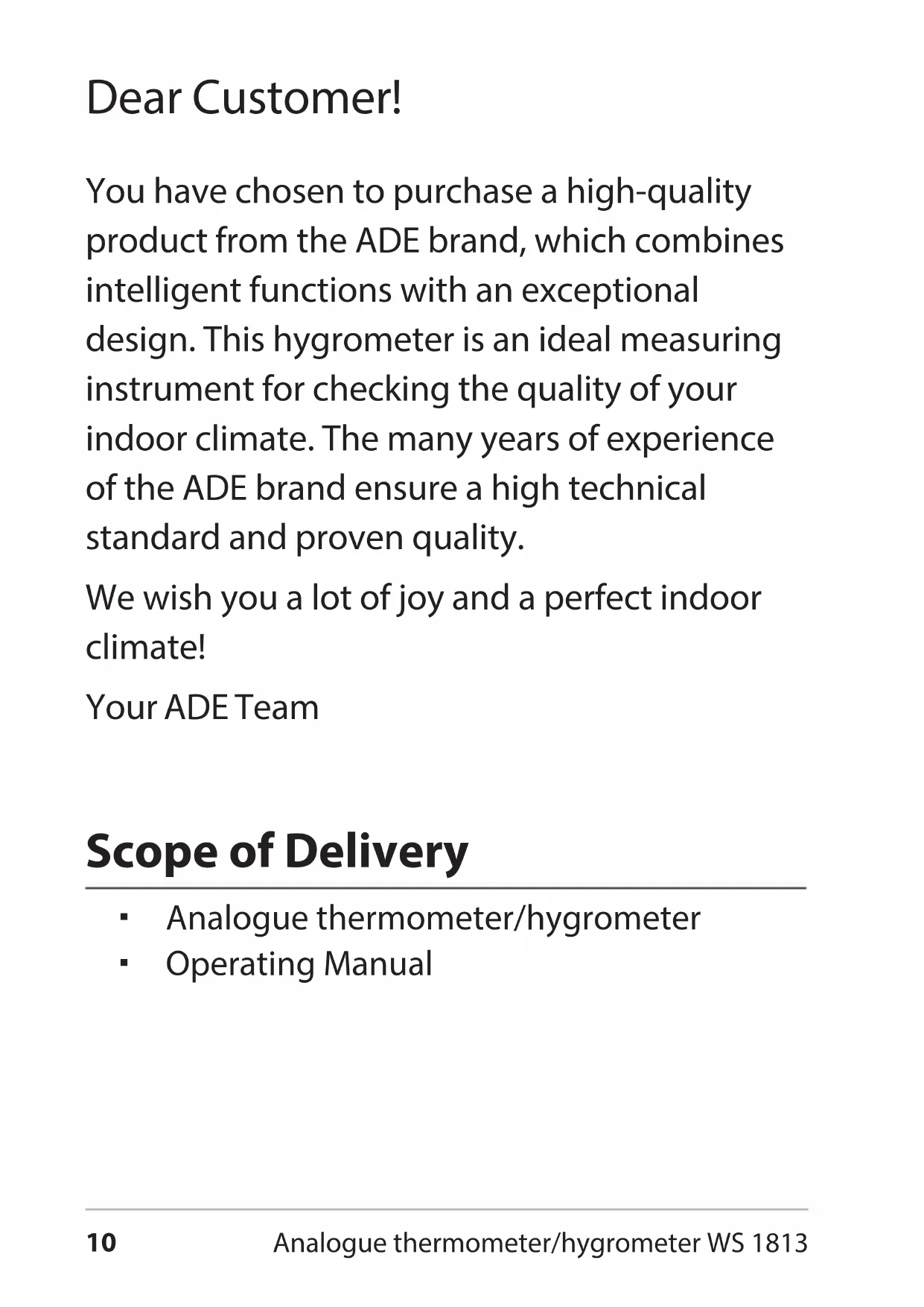 Download the instructions for your Thermometer Hygrometer in PDF format for free! Find your manual WS 1813 - ADE and take your electronic device back in hand. On this page are published all the documents necessary for the use of your device. WS 1813 by ADE.