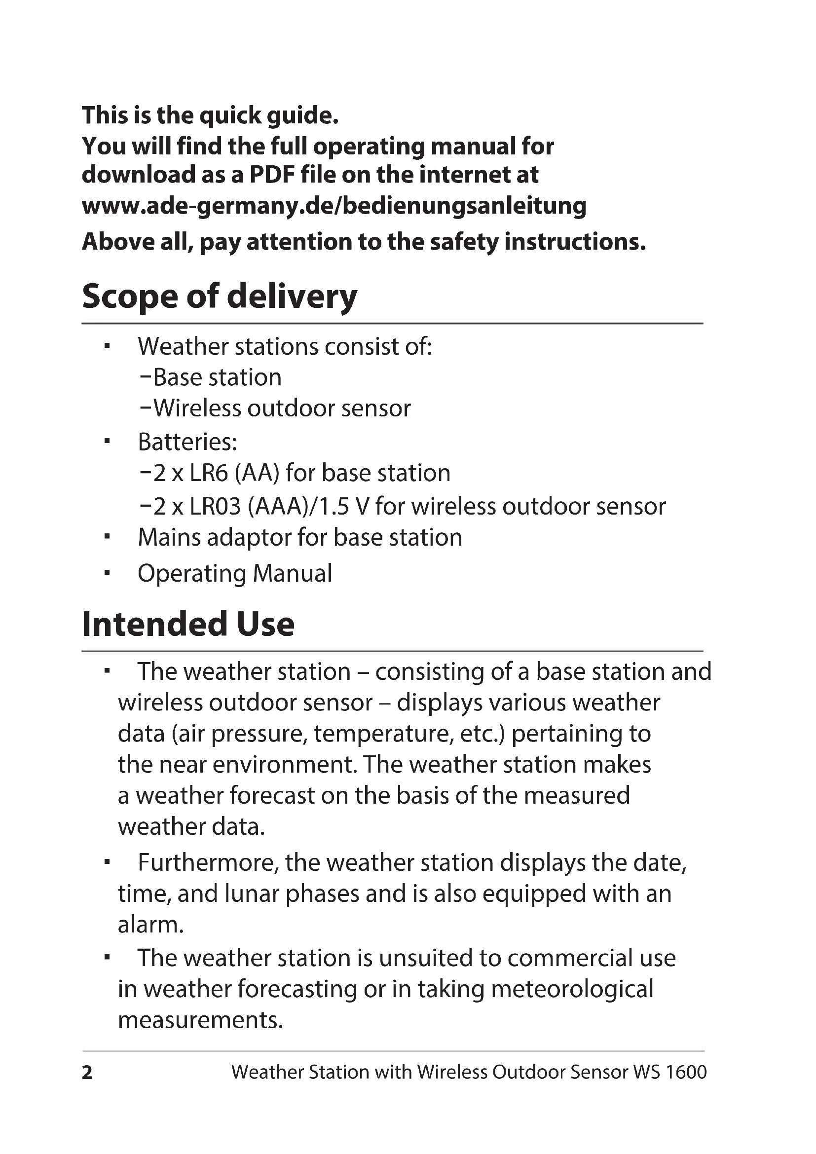 WS 1600 - Weather Station ADE - Free user manual and instructions