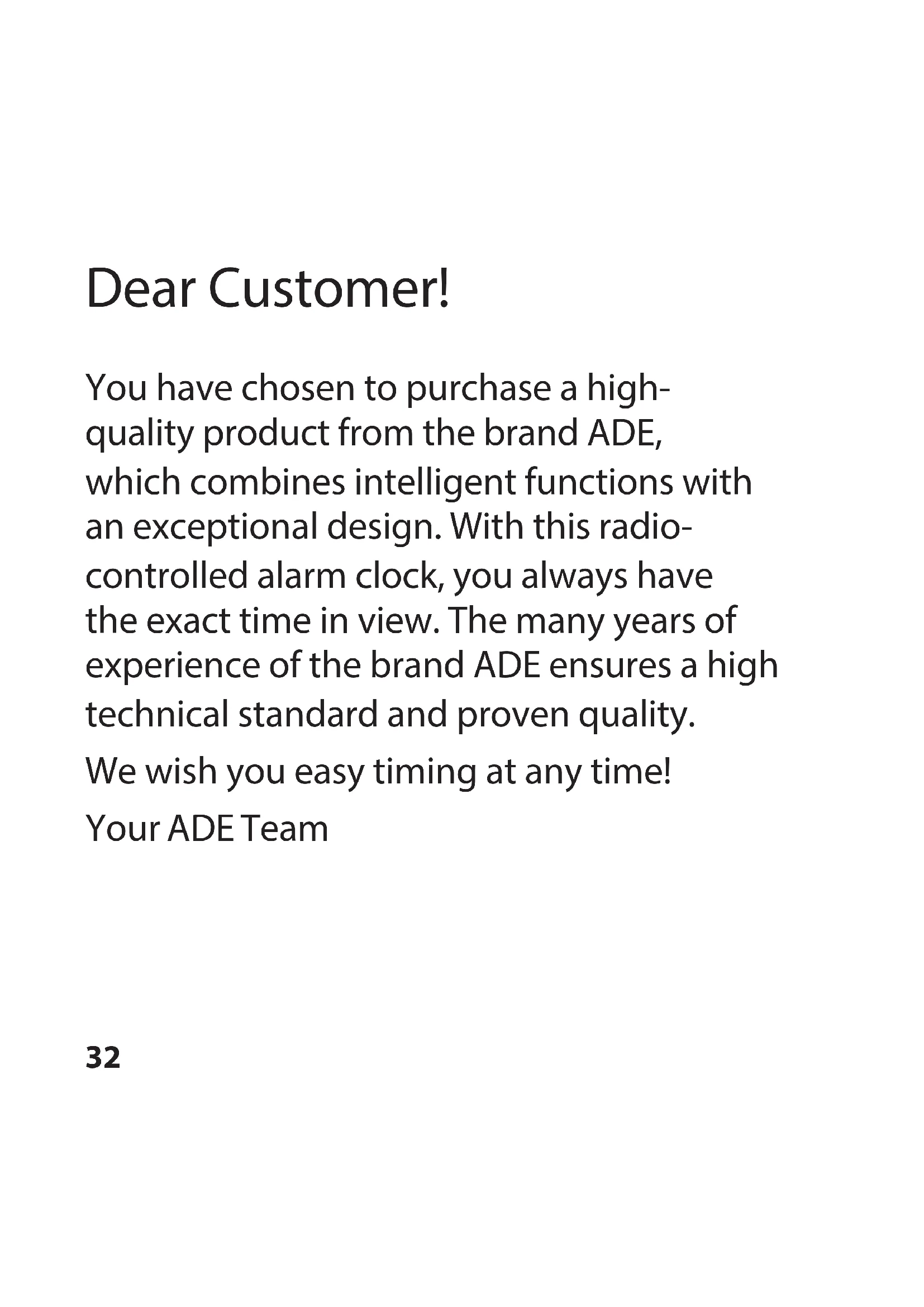 You have chosen to purchase a high-quality product from the brand ADE, which combines intelligent functions with an exceptional design. With this radio-controlled alarm clock, you always have the exact time in view. The many years of experience of the brand ADE ensures a high technical standard and proven quality.