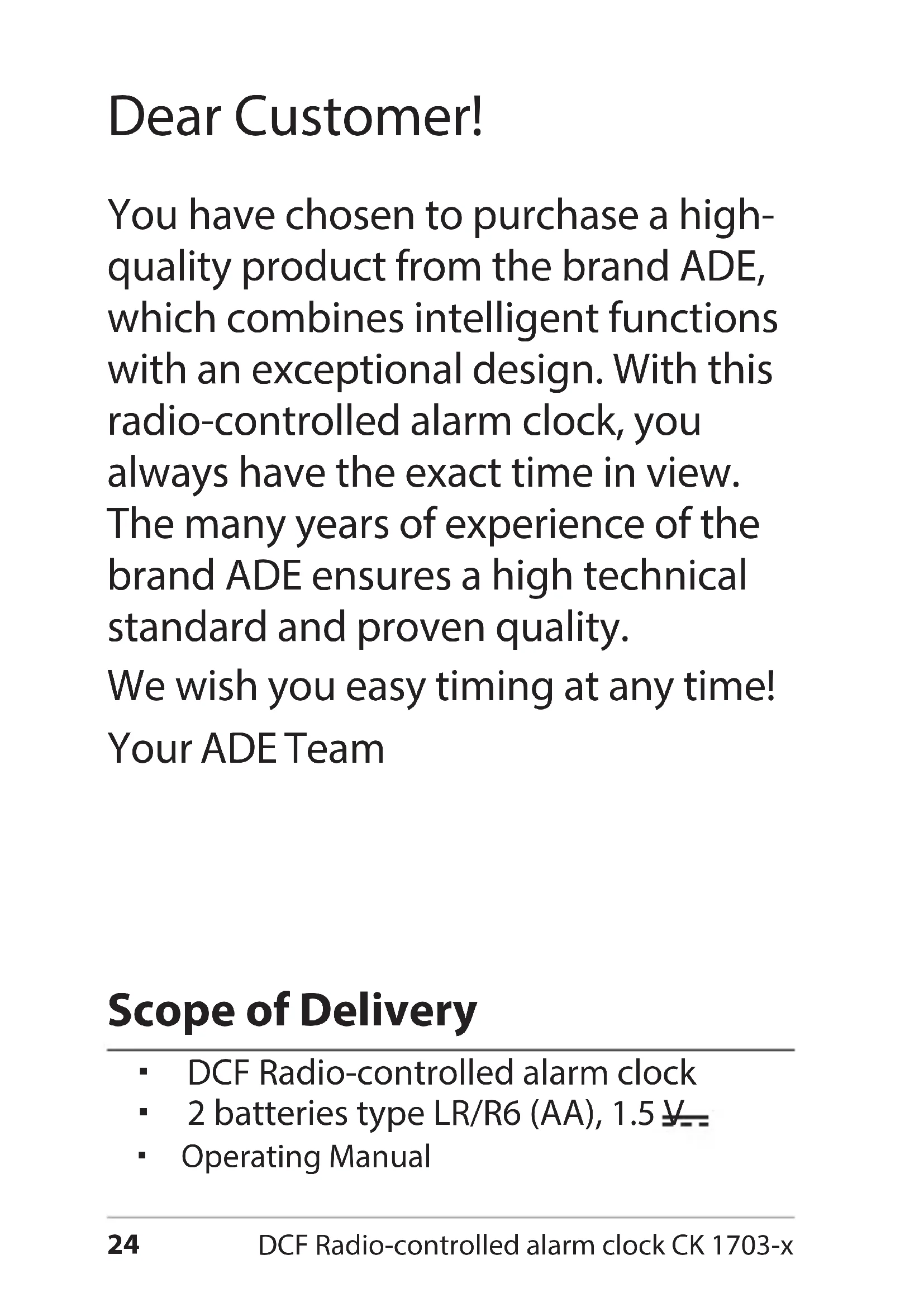 Download the instructions for your Alarm clock radio in PDF format for free! Find your manual CK 1703 - ADE and take your electronic device back in hand. On this page are published all the documents necessary for the use of your device. CK 1703 by ADE.