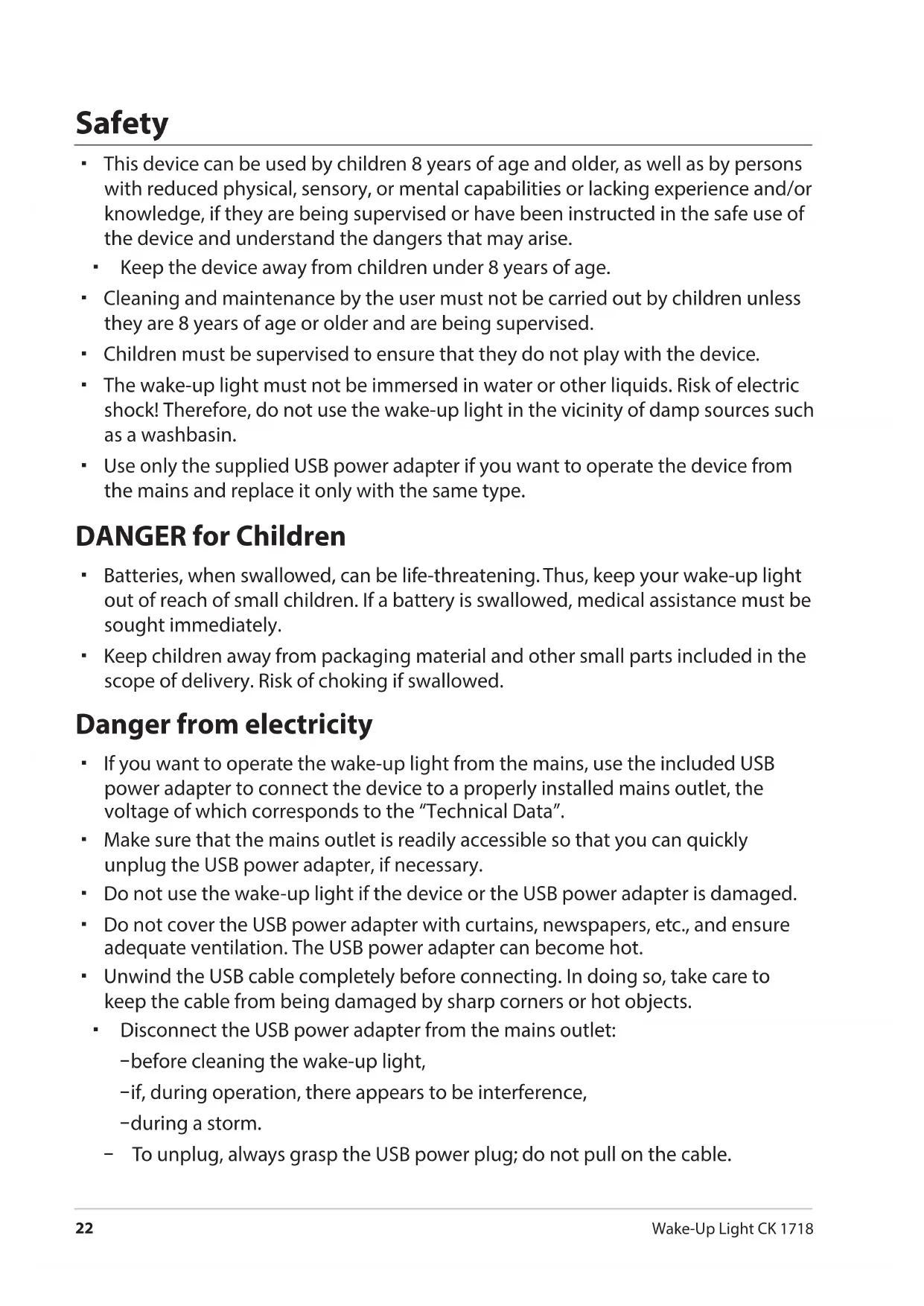 - The wake-up light must not be immersed in water or other liquids. Risk of electric shock! Therefore, do not use the wake-up light in the vicinity of damp sources such as a washbasin.
