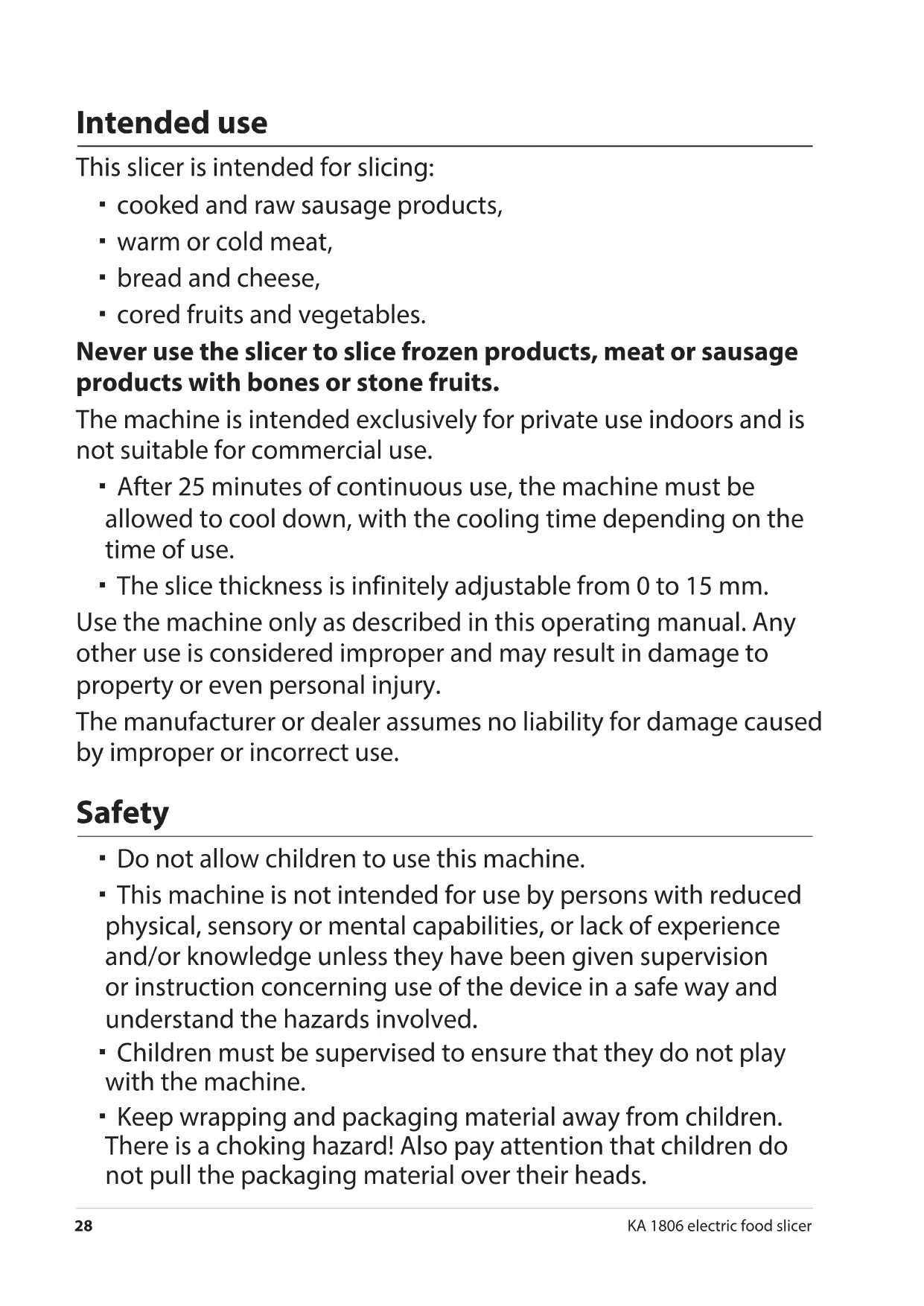 Never use the slicer to slice frozen products, meat or sausage products with bones or stone fruits.