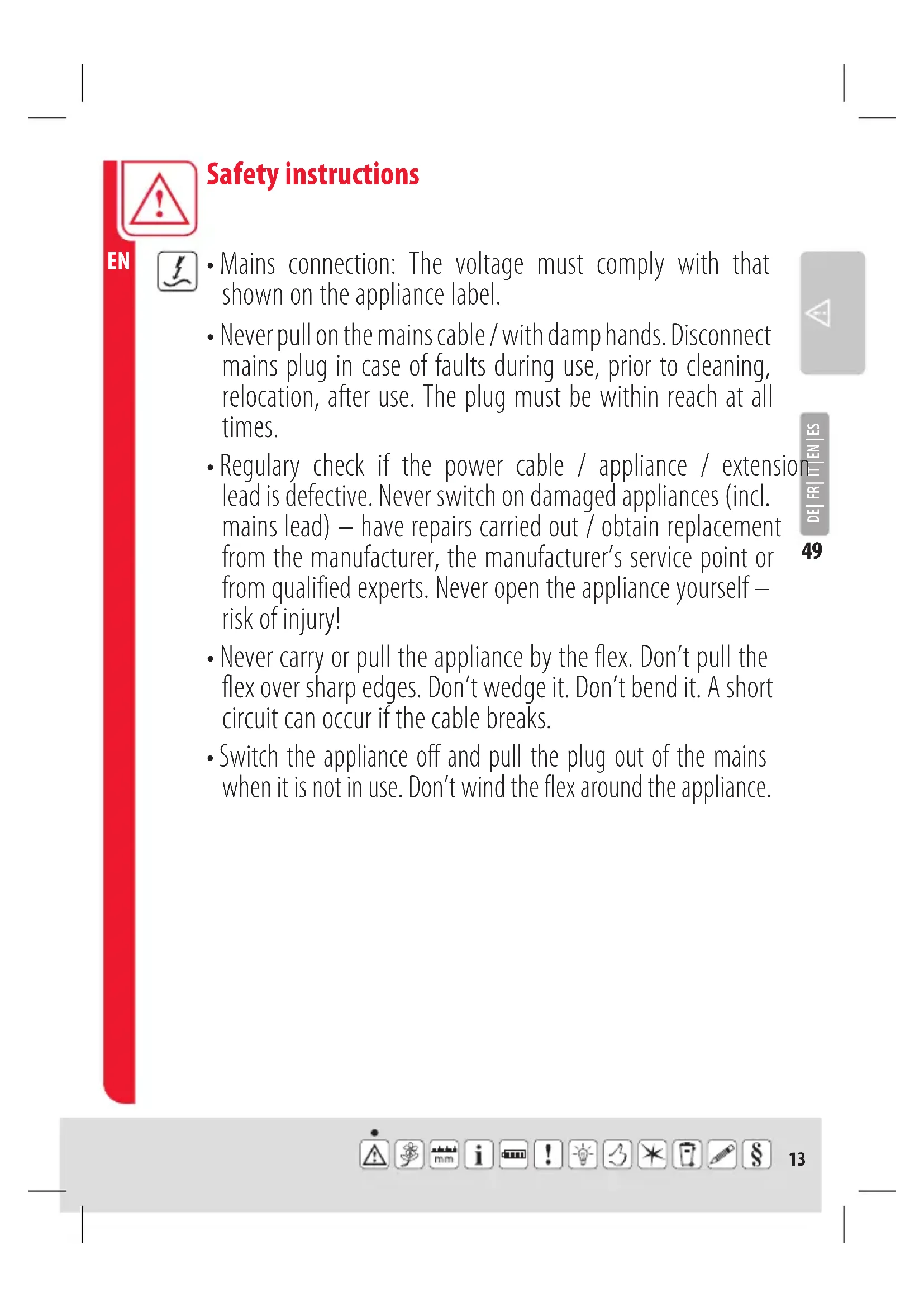 - Never carry or pull the appliance by the flex. Don’t pull the flex over sharp edges. Don’t wedge it. Don’t bend it. A short circuit can occur if the cable breaks.