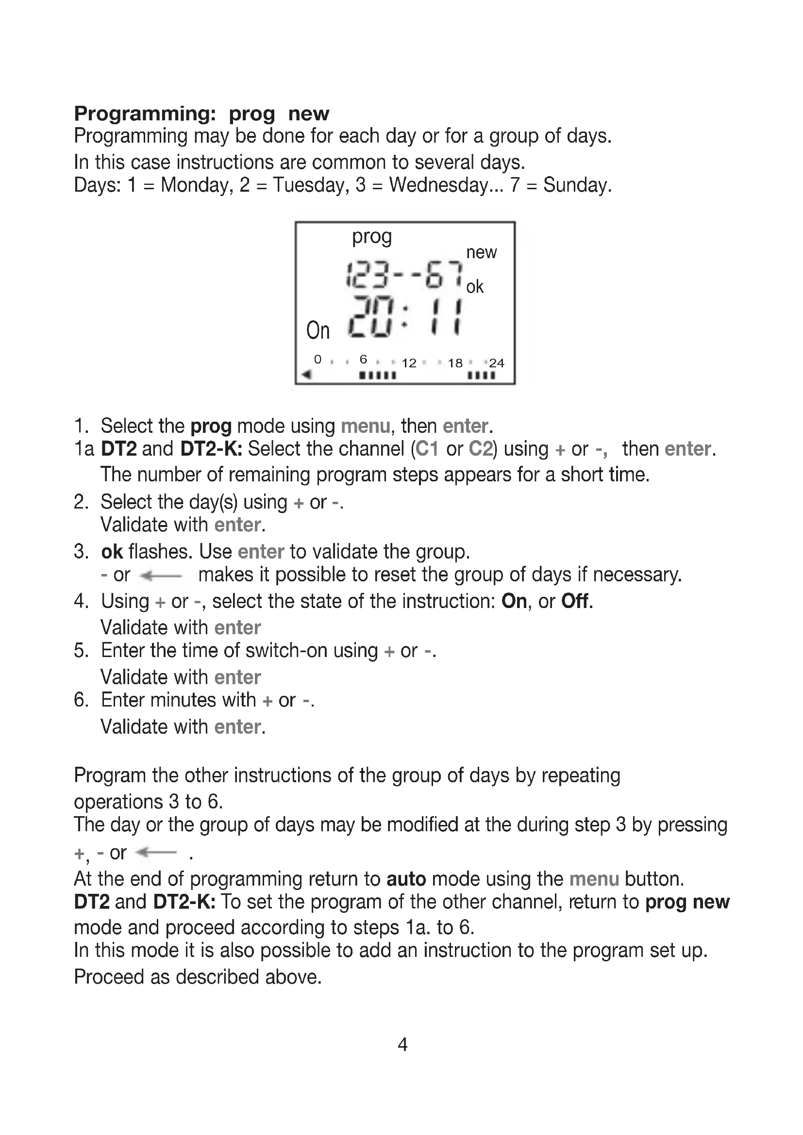 : to return to the previous step. You may return into auto mode at any moment using menu. If no action is taken for 1 min., the switch returns into auto mode.4 Programming: prog new Programming may be done for each day or for a group of days. In this case instructions are common to several days. Days: 1 = Monday, 2 = Tuesday, 3 = Wednesday... 7 = Sunday.