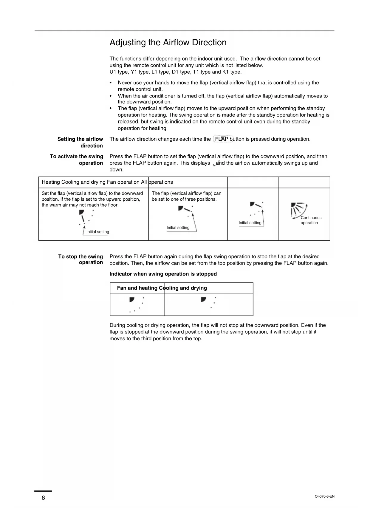 *DBT: Dry bulb temperature *WBT: Wet bulb temperature NOTE NOTE OI-070-5-EN 01_85464609070013_EN.fm Page 5 Thursday, February 3, 2011 3:19 PM6 Adjusting the Airflow Direction The functions differ depending on the indoor unit used. The airflow direction cannot be set using the remote control unit for any unit which is not listed below. U1 type, Y1 type, L1 type, D1 type, T1 type and K1 type.