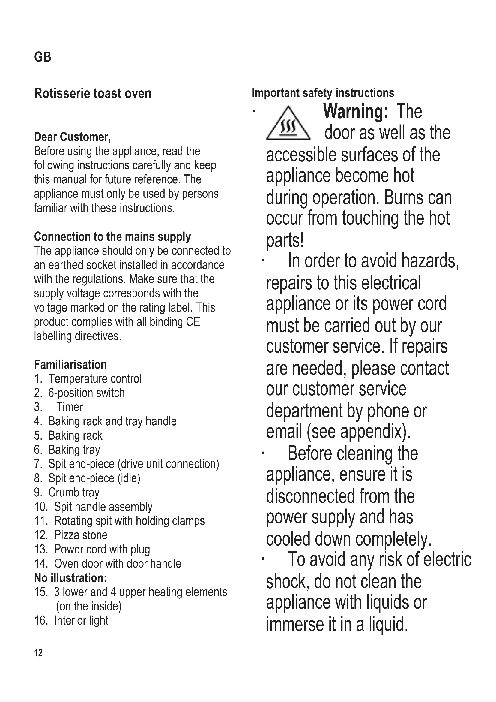 Important safety instructions ∙ Warning: The door as well as the accessible surfaces of the appliance become hot during operation. Burns can occur from touching the hot parts! ∙ In order to avoid hazards, repairs to this electrical appliance or its power cord must be carried out by our customer service. If repairs are needed, please contact our customer service department by phone or email (see appendix). ∙ Before cleaning the appliance, ensure it is disconnected from the power supply and has cooled down completely. ∙ To avoid any risk of electric shock, do not clean the appliance with liquids or immerse it in a liquid. GB104 x 142 mm