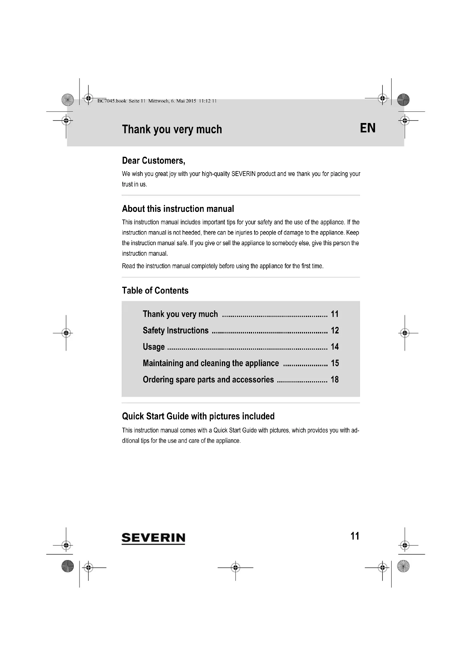USER MANUAL BC 7044 SEVERIN