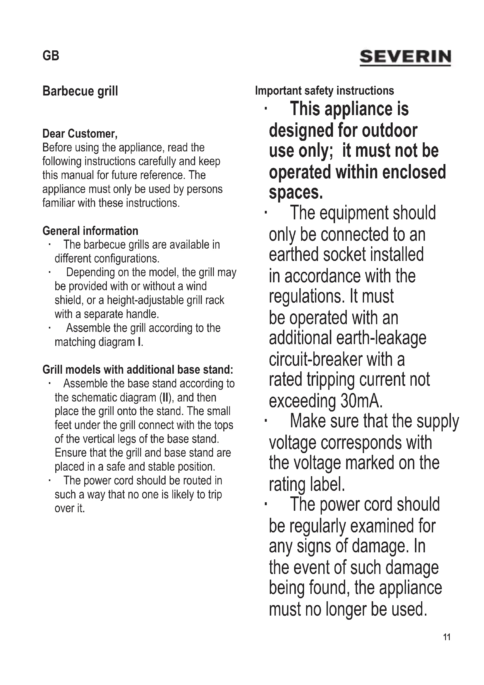 Barbecue grill Dear Customer, Before using the appliance, read the following instructions carefully and keep this manual for future reference. The appliance must only be used by persons familiar with these instructions. General information ∙ The barbecue grills are available in different congurations. ∙ Depending on the model, the grill may be provided with or without a wind shield, or a height-adjustable grill rack with a separate handle. ∙ Assemble the grill according to the matching diagram I. Grill models with additional base stand: ∙ Assemble the base stand according to the schematic diagram (II), and then place the grill onto the stand. The small feet under the grill connect with the tops of the vertical legs of the base stand. Ensure that the grill and base stand are placed in a safe and stable position. ∙ The power cord should be routed in such a way that no one is likely to trip over it. Important safety instructions ∙ This appliance is designed for outdoor use only; it must not be operated within enclosed spaces. ∙ The equipment should only be connected to an earthed socket installed in accordance with the regulations. It must be operated with an additional earth-leakage circuit-breaker with a rated tripping current not exceeding 30mA. ∙ Make sure that the supply voltage corresponds with the voltage marked on the rating label. ∙ The power cord should be regularly examined for any signs of damage. In the event of such damage being found, the appliance must no longer be used. GB12 104 x 142 mm ∙ In order to avoid hazards, and to comply with safety requirements, repairs to this electrical appliance or its power cord must be carried out by our customer service. If repairs are needed, please contact our customer service department by phone or email (see appendix). ∙ Before cleaning the grill, ensure it is disconnected from the power supply and has completely cooled down. ∙ To avoid the risk of electric shock, the heating element and power cord must not be immersed in liquid or even allowed to come into contact with it. ∙ Clean the rack with hot soapy water or in a dish- washer. For detailed information on cleaning the appliance, please refer to the section Cleaning and care. ∙ The appliance is not intended to be operated by means of an external timer or separate remote-control system. ∙ Do not, under any circumstances, use charcoal or any other solid or liquid fuel to operate the grill. ∙ Caution: Do not cover the rack with aluminium foil, barbecue dishes or other items, as the resulting build-up of heat could seriously damage the grill. ∙ The picture shows how much water should be put into the grill pan. ∙ This appliance may be used by children (at least 8 years of age) and by persons with reduced104 x 142 mm