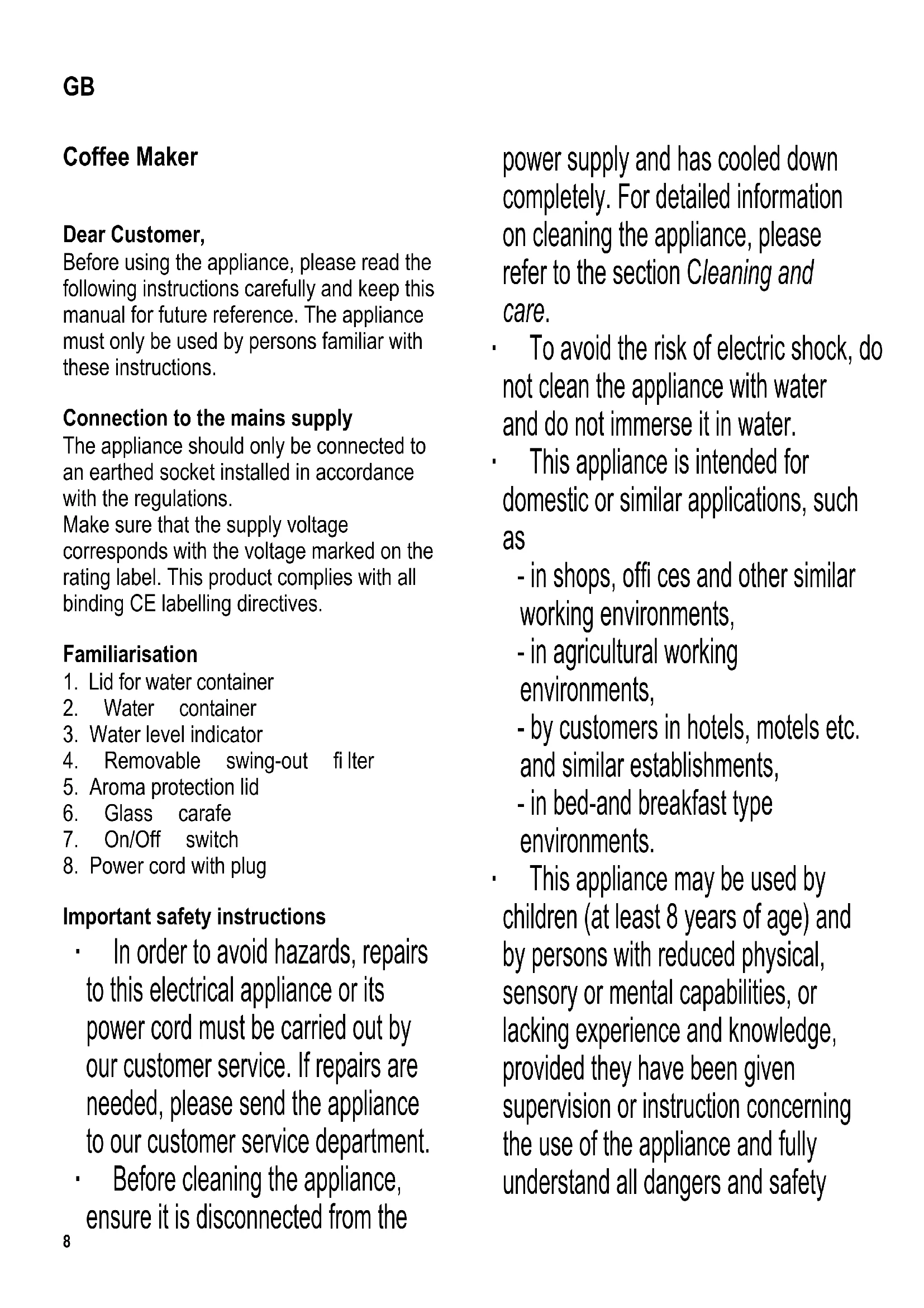 - in shops, offi ces and other similar working environments, - in agricultural working environments, - by customers in hotels, motels etc. and similar establishments, - in bed-and breakfast type environments. ∙ This appliance may be used by children (at least 8 years of age) and by persons with reduced physical, sensory or mental capabilities, or lacking experience and knowledge, provided they have been given supervision or instruction concerning the use of the appliance and fully understand all dangers and safety GB9 precautions involved. ∙ Children must not be permitted to play with the appliance. ∙ Children must not be permitted to carry out any cleaning or maintenance work on the appliance unless they are supervised and at least 8 years of age. ∙ The appliance and its power cord must be kept well away from children under 8 at all times. ∙ Caution: Keep any packaging materials well away from children – these are a potential source of danger, e.g. of suffocation. ∙ Every time the appliance is used, the main body including the power cord as well as any attachment fi tted should be checked thoroughly for any defects. Should the appliance, for instance, have been dropped onto a hard surface, or if excessive force has been used to pull the power cord, it must no longer be used: even invisible damage may have adverse effects on the operational safety of the appliance. ∙ Before use, make sure that the handle of the glass carafe is properly and securely fi tted. If necessary, the metal ring may be tightened by means of the screw in the handle. ∙ During operation, the coffee maker must be placed on a level, non-slip surface, impervious to splashes and stains. ∙ Do not allow the appliance or its power cord to touch hot surfaces or to come into contact with any heat sources. ∙ Caution: the hot-plate becomes very hot during operation. ∙ To prevent the danger of hot water or steam being emitted, always switch off the coffee maker and allow suffi cient time for the appliance to cool down before it is opened or any accessories or attachments are removed. ∙ Children should be supervised to ensure that they do not play with the appliance. ∙ Remove the plug from the wall socket - in case of any malfunction, - during cleaning, - if the appliance is not being used for an extended period of time. ∙ When removing the plug from the wall socket, never pull on the power cord; always grip the plug itself. ∙ Do not allow the power cord to hang free; the cord must be kept well away from hot parts of the appliance. ∙ No responsibility will be accepted if damage results from improper use, or if these instructions are not complied with. Before using for the fi rst time Before making coffee for the fi rst time, let the appliance go through two or three fi ltration cycles using the indicated maximum amount of cold water, but without using ground coffee. This should also be done if the appliance has not been used for an extended period of time, and after descaling. General information ∙ A measuring scale on the water container and on the glass carafe facilitates fi lling the container with the correct amount of clean water. With a dual-scale, the left scale is used for regular-sized cups10 of approx.125ml, while the right scale is used for smaller cups. Make sure that the indicated maximum amount of water is not exceeded. ∙ If several consecutive brewing cycles are required, switch off the coffee maker after each cycle and let the appliance cool down for approx. 5 minutes. ∙ Important note: When fi lling the appliance with fresh water shortly after a brewing cycle is completed, there is a danger of scalding from hot water or steam escaping through the water outlet. Making coffee ∙ Filling with water: Open the water container lid, fi ll the container with the desired quantity of water and replace the lid. ∙ Inserting the paper fi lter: Open the swing-out fi lter sideways and insert a size-4 paper fi lter, fi rst folding down the perforated sides of the fi lter. ∙ Filling with ground coffee: For each regular-sized cup (125ml), a measure of about 6 g (= 1½ - 2 teaspoons) of medium or fi nely ground coffee will be required. Close the swing-out fi lter afterwards. ∙ Preparing the glass carafe: Fit the aroma protection lid onto the carafe, and then place the carafe into the appliance. If correctly inserted, the lid will disable the drip-stop mechanism in the fi lter holder during the brewing cycle. ∙ Starting the brewing cycle: Insert the plug into a suitable wall outlet and use the On/Off switch to switch the coffee maker on. The fi ltration cycle starts and the water passes through the fi lter. ∙ Removing the glass carafe: Wait until all the water has passed through the fi lter before the carafe is removed from the appliance. ∙ Switching off the coffee maker: The coffee may be kept warm inside the carafe by leaving it standing on the hot-plate. The plate is kept warm until the appliance is switched off. Always switch off the appliance after use and remove the plug from the wall socket. Descaling ∙ Depending on the water quality (lime content) in your area as well as the frequency of use, all thermal household appliances using hot water need descaling (i.e. removal of lime deposits) on a regular basis to warrant proper functioning. ∙ Any warranty claim will be null and void if the appliance malfunctions because of insuffi cient descaling. ∙ A lengthening of the brewing time and increased noise during brewing indicate that descaling of the coffee maker has become necessary. ∙ An excessive build-up of lime deposits is very diffi cult to remove, even when strong descaling agents are used. It may also cause the brewing system to leak. We therefore strongly recommend descaling the appliance after each thirty to forty brewing cycles. For descaling, a vinegar solution may be used as follows: ∙ Mix 80 ml of vinegar essence with the indicated maximum amount of cold wa