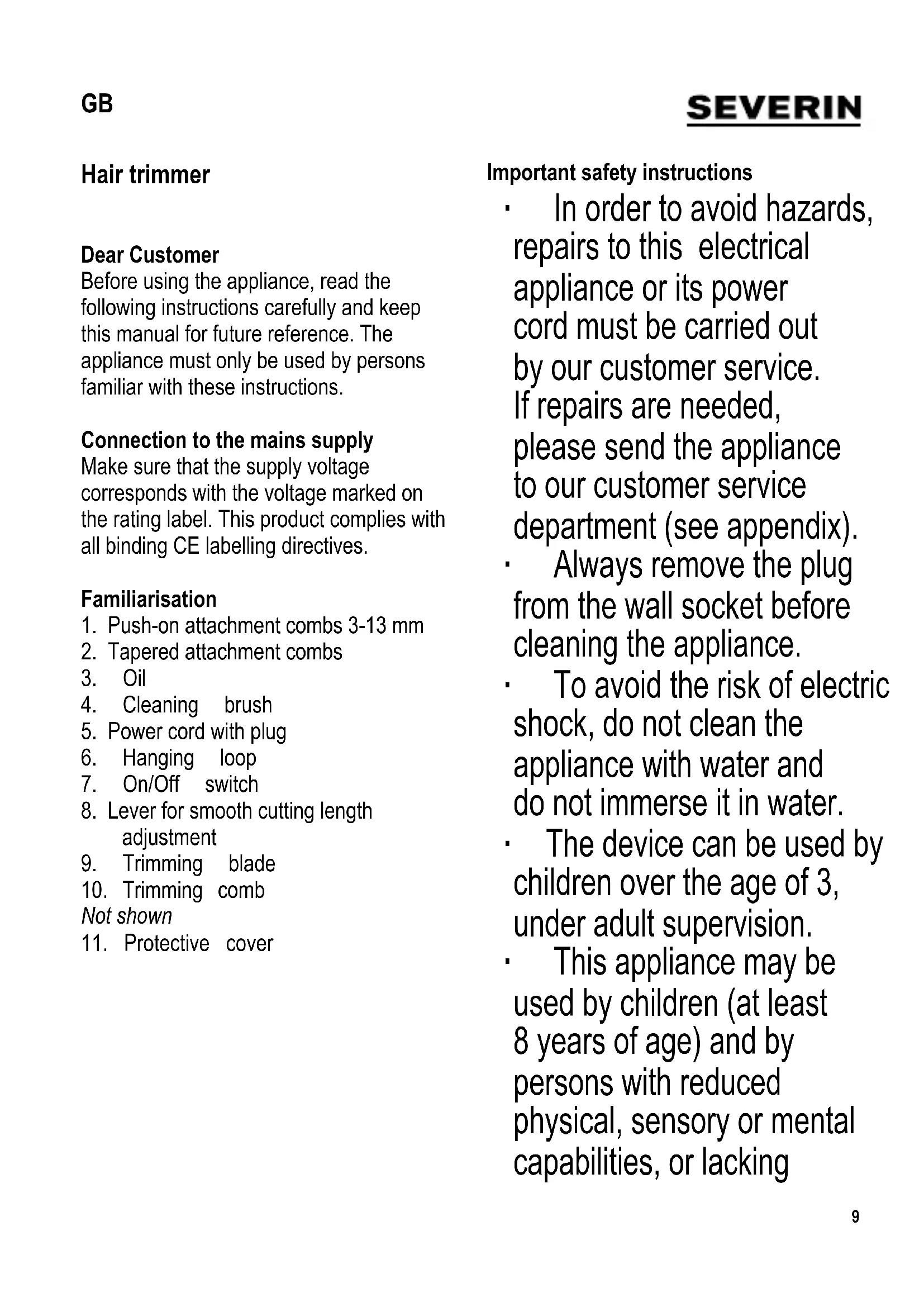 Important safety instructions ∙ In order to avoid hazards, repairs to this electrical appliance or its power cord must be carried out by our customer service. If repairs are needed, please send the appliance to our customer service department (see appendix). ∙ Always remove the plug from the wall socket before cleaning the appliance. ∙ To avoid the risk of electric shock, do not clean the appliance with water and do not immerse it in water. ∙ The device can be used by children over the age of 3, under adult supervision. ∙ This appliance may be used by children (at least 8 years of age) and by persons with reduced physical, sensory or mental capabilities, or lacking GB10 experience and knowledge, provided they have been given supervision or instruction concerning the use of the appliance and fully understand all dangers and safety precautions involved. ∙ Children must not be permitted to play with the appliance. ∙ Cleaning and user maintenance may not be carried out by children without supervision. ∙ The appliance and its power cord must be kept well away from children under 3 at all times. ∙ Caution: Keep any packaging materials well away from children – these are a potential source of danger, e.g. of suffocation. ∙ Caution: Do not use the appliance near a bath or a washbasin with water in, or any other receptacle containing water. ∙ Caution: Protect the appliance from moisture and splashing water and do not operate it with wet hands. ∙ If the appliance is used in a bathroom, the presence of water represents a danger even if the appliance is switched off. Therefore, always remove the plug from the wall socket after use. Additional protection is offered by fi tting an earth-leakage circuit-breaker with a rated tripping current not exceeding 30 mA into your home installation. Please consult a qualifi ed electrician. ∙ Before the appliance is used, the main body as well as any attachment fi tted should be checked thoroughly for any defects. Should the appliance, for instance, have been dropped onto a hard surface, it must no longer be used: even invisible damage may have adverse effects on the operational safety of the appliance. ∙ Always switch off and remove the plug from the wall socket after use, as well as - in cases of malfunction, and - during cleaning. ∙ When removing the plug from the wall socket, never pull on the power cord; always grip the plug itself. ∙ Caution: the trimming blade is extremely sharp; to prevent injuries, ensure that at all times during use the blade does not touch the skin. ∙ Do not operate the appliance without supervision. ∙ No responsibility is accepted if damage results from improper use, or if these instructions are not complied with.11 ∙ Do not use the appliance on pets or other animals. Use Cutting length fi ne adjustment The side adjusting lever allows smooth fi ne-adjustment of the cutting length from approx. 1 to 1.6 mm, even during operation. Trimming heads The push-on combs provided extend the range of the cutting length. Fit the required head attachment onto the trimming comb, pushing it fi rmly down until it is heard locking into place. After use, release the attachment at the back and lift it off. Trimming heads 3-13 mm The trimming heads provided allow for cutting lengths of 3, 6, 9 and 13 mm. Tapered trimming heads The tapered trimming heads are designed for cutting the hair while avoiding a ‘stepped’ effect. In this way, the hair above the ears is cut shorter, while remaining longer towards the top of the head. Operation ∙ Before cutting, the hair should be clean and thoroughly combed fi rst. ∙ When cutting longer hair, use a push-on comb or cut hair above a normal comb. ∙ Always start with the largest push-on comb, as this will help you to get a feel for cutting the hair to the desired length. ∙ For shorter hair-cuts, follow-up with a smaller push-on comb or without any comb attachment. ∙ Insert the plug into a wall outlet and turn the appliance on. ∙ Cut from bottom to top with the trimming comb lying against the head; lead the appliance upwards through the hair, moving it gradually away from the head at the same time. ∙ The tapered trimming heads are designed for cutting the hair around the ears while avoiding a ‘stepped’ effect. For the right side of the head, the attachment marked ‘Right Taper’ should be used; for the opposite side use the one marked ‘Left Taper’. Start trimming from the back of the head and cut the hair against its natural direction of growth towards the temples. ∙ For a shaped cut, reverse the appliance and shorten the hair from top to bottom without a push-on comb. ∙ Always switch off after use and remove the plug from the wall socket.12 Care and Cleaning ∙ It is essential to switch off the unit and remove the plug from the wall socket before cleaning and oiling. ∙ To avoid the risk of electric shock, the appliance must not be immersed in liquid or even allowed to come into contact with liquid. ∙ Do not use abrasives or harsh cleaning solutions. ∙ If necessary, the housing may be wiped with a dry, lint-free cloth. Trimming comb and trimming blade ∙ After each use, use the cleaning brush to remove the hair between the trimming comb and the trimming blade. ∙ After cleaning, and also after the appliance has been used for approx. 20 minutes, put a few drops of acid-free oil between the trimming comb and the trimming blade and then switch the appliance briefl y on to ensure that the oil is well and evenly distributed. Regular oiling will guarantee good cutting performance over a long period and thus a long service life. ∙ When the appliance is not in use, put the protective cover over the trimming comb. Disposal Devices marked with this symbol must be disposed of separately from your household waste, as they contain valuable materials which can be recycled. Proper disposal protects the environment and human health. Your local authority o