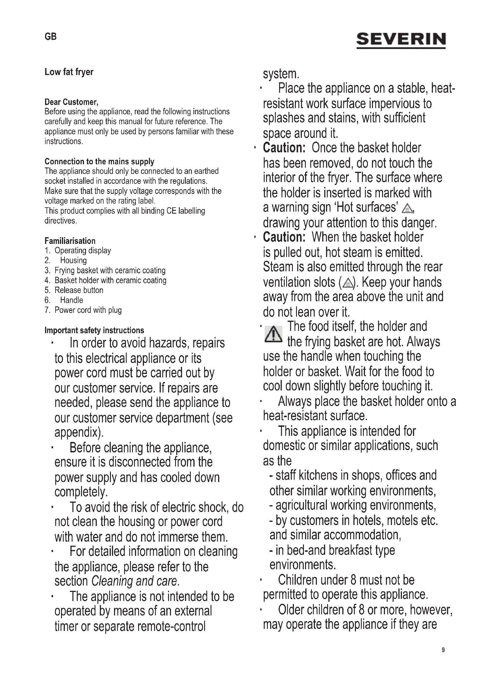 Important safety instructions ∙ In order to avoid hazards, repairs to this electrical appliance or its power cord must be carried out by our customer service. If repairs are needed, please send the appliance to our customer service department (see appendix). ∙ Before cleaning the appliance, ensure it is disconnected from the power supply and has cooled down completely. ∙ To avoid the risk of electric shock, do not clean the housing or power cord with water and do not immerse them. ∙ For detailed information on cleaning the appliance, please refer to the section Cleaning and care. ∙ The appliance is not intended to be operated by means of an external timer or separate remote-control system. ∙ Place the appliance on a stable, heat- resistant work surface impervious to splashes and stains, with sufcient space around it. ∙ Caution: Once the basket holder has been removed, do not touch the interior of the fryer. The surface where the holder is inserted is marked with a warning sign ‘Hot surfaces’