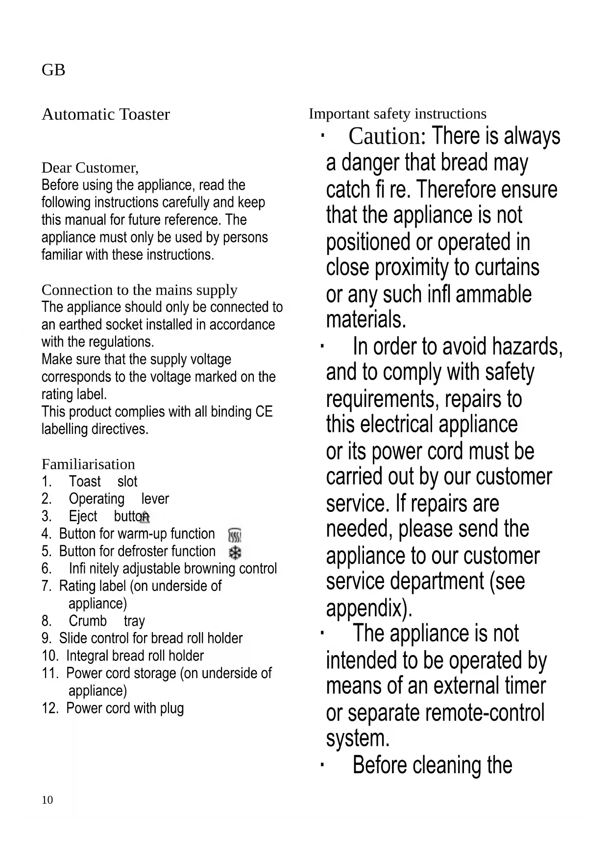 Important safety instructions ∙ Caution: There is always a danger that bread may catch fi re. Therefore ensure that the appliance is not positioned or operated in close proximity to curtains or any such infl ammable materials. ∙ In order to avoid hazards, and to comply with safety requirements, repairs to this electrical appliance or its power cord must be carried out by our customer service. If repairs are needed, please send the appliance to our customer service department (see appendix). ∙ The appliance is not intended to be operated by means of an external timer or separate remote-control system. ∙ Before cleaning the GB11 appliance, ensure it is disconnected from the power supply and has cooled down completely. ∙ To avoid the risk of electric shock, do not clean the appliance with liquids or immerse it. ∙ To clean the housing, it is only necessary to wipe the outside with a slightly damp cloth. ∙ To empty the crumb tray, pull it out sideways. Make sure to replace the tray before the toaster is used again. ∙ This appliance is intended for domestic or similar applications, such as - in staff kitchens in shops, offi ces and other similar working environments, - in agricultural working environments, - by customers in hotels, motels etc. and similar accommodation, - in bed-and breakfast type environments. ∙ This appliance may be used by children (at least 8 years of age) and by persons with reduced physical, sensory or mental capabilities, or lacking experience and knowledge, provided they have been given supervision or instruction concerning the use of the appliance and fully understand all dangers and safety precautions involved. ∙ Children must not be permitted to play with the appliance. ∙ Children must not be permitted to carry out any cleaning or maintenance work on the appliance unless they are supervised12 and at least 8 years of age. ∙ The appliance and its power cord must be kept well away from children under 8 at all times. ∙ Caution: Keep any packaging materials well away from children – these are a potential source of danger, e.g. of suffocation. ∙ Always position the appliance upright on a level heat-resistant surface. ∙ In order to prevent damage to the housing, do not position the appliance on or near hot surfaces or open fl ames such as hot-plates or gas fl ames. ∙ Caution: The accessible housing surfaces become very hot during operation. Burns can occur from touching the hot parts. ∙ Every time the appliance is used, the main body including the power cord as well as any attachment fi tted should be checked thoroughly for any defects. Should the appliance, for instance, have been dropped onto a hard surface, or if excessive force has been used to pull the power cord, it must no longer be used: even invisible damage may have adverse effects on the operational safety of the appliance. ∙ Do not allow the power cord to touch hot surfaces. ∙ Do not let the power cord hang free. ∙ Do not leave the appliance unattended while in use. ∙ Do not cover the toast slot during operation. ∙ Do not place bread rolls directly over the toast slots. ∙ Caution: To prevent damage to the appliance, do not attempt to heat bread slices on the bread roll holder. ∙ Do not try to remove bread from the toaster with your fi ngers or insert any other objects (e.g. knives, forks) into the toast slot as the heating elements carry a live current. ∙ Always remove the plug from the wall socket - after use, - in case of any malfunction, - before cleaning the appliance. ∙ When removing the plug from the wall socket, never pull on the power cord; always grip the plug itself. ∙ No responsibility will be accepted if damage results from improper use, or if these instructions are not complied with. Intended use ∙ This appliance is intended only for toasting single bread slices in each toast slot and for warming bread rolls on the bread roll holder. ∙ Toasting of several slices of bread in one slot or browning (au gratin) other foods must not be attempted. ∙ Do not use foods with any kind of fi lling or spread (e.g. butter or jam) in or on this appliance. ∙ Any use other than that described in these instructions must be considered improper and may lead to personal injury or material damage.13 Operation General information ∙ Caution: The operating lever locks down only when the plug is inserted. ∙ Do not use slices which are too thick or too big, as they may become stuck in the toaster. The thickness of the slices to be toasted should not exceed 14 mm. ∙ In case of problems or malfunctions during use, and before cleaning, always remove the plug from the wall socket. ∙ To remove a slice caught in the slot, use a blunt wooden implement (e.g. a brush handle). Never touch the metal heating elements. Before using for the fi rst time ∙ Clean the toaster thoroughly (see Cleaning and care). ∙ Switch on the toaster without any bread inserted and go through at least fi ve toasting cycles at the maximum temperature setting. ∙ Allow the toaster to cool down between cycles. ∙ When switching on the appliance for the fi rst time, the toaster may emit a slight smell and a little smoke, which will disappear after a short while. For that reason, adequate ventilation should be ensured by opening windows or balcony doors. Automatic switch-off This appliance comes with an automatic switch-off feature. If a bread slice should become stuck and cannot be ejected after the toasting cycle is complete, the toaster will automatically switch off. Should this occur, disconnect the appliance from the mains and remove the bread slice as described in the section General information. Adjusting the degree of browning The desired degree of browning can be varied by turning the adjustable browning control knob. Light: turn the control knob anti-clockwise. Dark: turn the control knob clockwise. In the case of sliced bread specifi cally intended for toasting, we recommend se