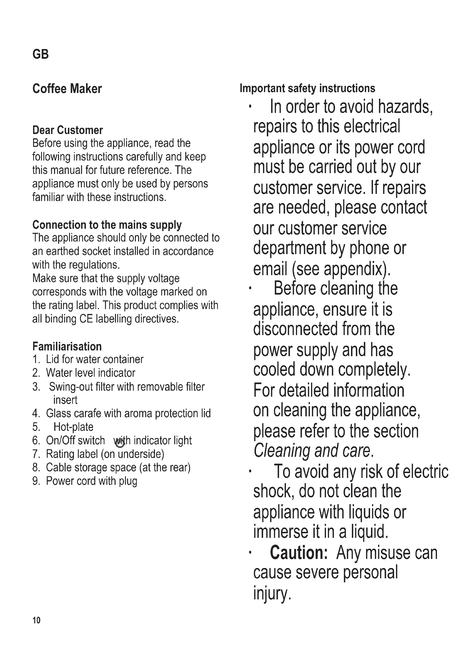 holder,rstfoldingdowntheperforated sidesofthelter. ∙ Filling with ground coffee: For each regular-sized cup (125 ml), a measure of about 6 g (= 1½ - 2 teaspoons) ofmediumornelygroundcoffeewill berequired.Closetheswing-outlter afterwards. ∙ Preparing the glass carafe: Fit the aroma protection lid onto the carafe, and then place the carafe into the appliance. If correctly inserted, the lid will disablethedrip-stopmechanisminthelter holder during the brewing cycle. ∙ Starting the brewing cycle: Insert the plug into a suitable wall socket and use the On/Off switch to turn the coffeemakeron.Theltrationcyclestarts andthewaterpassesthroughthelter. ∙ Removing the glass carafe: Wait until all the water has passed through thelterbeforethecarafeisremovedfrom the appliance. ∙ Switching off the coffee maker: The coffee may be kept warm inside the carafe by leaving it standing on the hot- plate. Once the last cup has been poured, press to switch the coffee maker off. Unless the appliance is switched off manually, the hot-plate remains hot for around 35 minutes after the brewing cycle, when the appliance will switch itself off automatically. Always switch off the appliance after use and remove the plug from the wall socket. Cleaning and care ∙ Before cleaning the appliance, ensure it is disconnected from the power supply and has cooled down completely. ∙ To avoid any risk of electric shock, do not clean the coffee maker with liquids or immerse it in a liquid. The appliance may be cleaned with a slightly damp cloth, using a mild detergent. Wipe dry afterwards. ∙ Do not use abrasives or harsh cleaning solutions. ∙ To remove the coffee grounds, open theswing-outlterandliftoutthelter insert. Dispose of the coffee grounds (as a natural substance, they may be composted). ∙ Rinseoutthelterinsert,wipeitdryand replace it. ∙ Closetheswing-outlter. ∙ Thecarafewithlidandthelterinsert may be cleaned with warm water or in a dishwasher after use. ∙ For easy cleaning, open the carafe lid and remove it by pulling it up. Replace it after cleaning, applying light pressure. Descaling ∙ Depending on the water quality (lime content) in your area as well as the frequency of use, all thermal household appliances using hot water need descaling (i.e. removal of lime deposits) on a regular basis to warrant proper functioning. ∙ Any warranty claim will be null and void if the appliance malfunctions because of insufcient descaling. ∙ A lengthening of the brewing time,14 104 x 142 mm increased noise during brewing or residual water remaining in the container indicate that descaling has become necessary. ∙ An excessive build-up of lime deposits isverydifculttoremove,evenwhen strong descaling agents are used. It may also cause the brewing system to leak. We therefore strongly recommend descaling the appliance after each thirty to forty brewing cycles. For descaling, a vinegar solution may be used as follows: ∙ Mix 80 ml of vinegar essence with the indicated maximum amount of cold water. ∙ Pour the descaling solution into the watercontainer,insertapaperlter intothelterholderwithout adding any ground coffee as described in section Making coffee, and let the appliancerunthroughoneltration cycle. Repeat the procedure if necessary. During descaling, ensure sufcientventilationanddonotinhale any vinegar vapours. ∙ To clean the appliance after descaling, letitrunthrough2-3ltrationcycles using clean water only. ∙ Do not pour descalers down enamel sinks. Disposal Devices marked with this symbol must be disposed of separately from your household waste, as they contain valuable materials which can be recycled. Proper disposal protects the environment and human health. Your local authority or retailer can provide information on the matter. Guarantee This product is guaranteed against defects in materials and workmanship for a period of two years from the date of purchase. Under this guarantee the manufacturer undertakes to repair or replace any parts found to be defective, providing the product is returned to one of our authorised service centres. This guarantee is only valid if the appliance has been used in accordance with the instructions, and provided that ithasnotbeenmodied,repairedor interfered with by any unauthorised person, or damaged through misuse. This guarantee naturally does not cover wear and tear, nor breakables such as glass and ceramic items, bulbs etc. This guarantee does not affect your statutory rights, nor any legal rights you may have as a consumer under applicable national legislation governing the purchase of goods. If the product fails to operate and needs to be returned, pack it carefully, enclosing your name and address and the reason for return. If within the guarantee period, please also provide the guarantee card and proof of purchase.104 x 142 mm