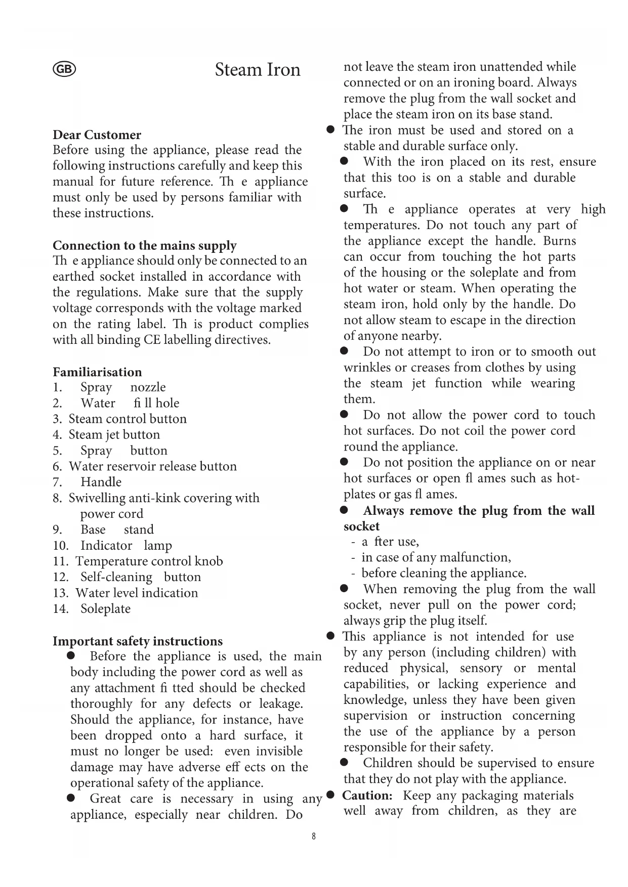 - •• cotton and linen (high temperature) – ese markings can also be found on the temperature control knob of the steam iron in form of dot symbols. Laundry to be ironed should be sorted according to the fabric ironing temperature. Follow the ironing symbols and start with the lowest temperature. When ironing highly sensitive fabrics, or if you are not sure about the fabrics, you may carefully test-iron at a non-visible point, e.g. inside of seam. Start with the lowest temperature. If the laundry is being dried in a dryer 9before ironing, the temperature should be adjusted to “iron dry”. Very dry fabrics are di cult to iron. Start up Clean the steam iron before using for the rst time, according to the instructions given in the paragraph “General Care and Cleaning - Self-cleaning system”. is will result in the removal of possible dust particles from the soleplate and subsequently lessen the smell typically encountered when rst switching on. Please ensure su cient ventilation. Ironing Always use the iron on a heat-resistant surface. Steam ironing requires high temperatures. e temperature level for steam ironing is indicated on the temperature control knob. –A er lling the reservoir with water, place the steam iron upright on its base stand and insert the plug into the wall socket; the main indicator lamp lights up. – Set the temperature control knob to the required ironing temperature as indicated by the ironing symbols. – During the heating-up process the indicator lamp will be on. e lamp will go out once the required ironing temperature is reached. Before ironing any fabrics, the soleplate should be cleaned by passing it over an old, clean cotton cloth, while using the steam jet function; this helps to ush out any dirt residues or lint particles trapped inside the openings in the soleplate. e steam output can be adjusted with the steam control button or completely switched o for dry ironing. For dry ironing, the water reservoir may be empty. Should there be water le in the reservoir, the steam jet function may also be used when dry-ironing at higher temperature settings. Place the steam iron upright on its base stand a er use and remove the plug from the wall socket. Automatic switch-o If the appliance is switched on but not being used for a certain period of time, it will automatically switch o . e automatic switch-o is indicated by the ashing main indicator lamp. As soon as the appliance is moved, it will switch on again. Horizontal position: With the iron standing on its sole plate, it will switch o a er approx 30 seconds of inactivity. Vertical position: When upright on its base stand, the iron will switch o a er approx. 8 minutes of inactivity. Steam Jet When the steam jet button is depressed, an additional hot steam jet is emitted from the soleplate. is function can be very useful when the regular amount of steam emitted is not su cient to remove stubborn creases or when ironing di cult or thick fabrics. e steam jet function may also be used with the iron held vertically, to remove creases or wrinkles from fabrics. Using the Spray Nozzle e laundry can be dampened by pressing the spray button. is will help to smooth out di cult areas. e spray nozzle may be used at any temperature level during dry or steam ironing. General Care and Cleaning Before cleaning the appliance, ensure it is disconnected from the power supply and has cooled down completely. To avoid the risk of electric shock, do not clean the appliance with water and do not immerse it in water. – If necessary, the unit may be wiped with a dry fuzz-free cloth. 10– Starch, fat and other deposits on the soleplate may be removed with a damp woollen cloth. – In order to protect the clean soleplate, you may occasionally apply a small amount of para n to the warm plate, wiping it o with a woollen cloth. Do not use abrasives or harsh cleaning solutions. Do not put vinegar or other descalers into the water reservoir. Self-cleaning system e self-cleaning system ushes out loose mineral deposits and keeps the appliance free of lime and dust particles. Self-cleaning should be performed if the iron has not been used for an extended period of time, or otherwise every 10-15 days. Proceed as follows: – Fill the water reservoir up to the maximum level mark with water. – Place the iron on its base stand and insert the plug into the wall socket. – Set the temperature control to its maximum. – Wait until the indicator light goes out. – Remove the plug from the wall socket. – Hold the iron horizontally over a sink. – With the self-cleaning button depressed, swing the iron lightly to and fro until no more steam or hot water is emitted. – Pour out any remaining water from the reservoir. – Allow the sole plate to cool down before cleaning it with a damp, lint-free cloth. Storage Turn o the steam iron, remove the plug from the wall socket and let the unit cool down completely. – Pour any remaining water out of the reservoir through the water ll hole. To avoid damage to the soleplate, store the steam iron in upright position on its base stand. Disposal Do not dispose of old or defective appliances in domestic garbage; this should only be done through public collection points. Guarantee is product is guaranteed against defects in materials and workmanship for a period of two years from the date of purchase. Under this guarantee the manufacturer undertakes to repair or replace any parts found to be defective, providing the product is returned to one of our authorised service centres. is guarantee is only valid if the appliance has been used in accordance with the instructions, and provided that it has not been modi ed, repaired or interfered with by any unauthorised person, or damaged through misuse. is guarantee naturally does not cover wear and tear, nor breakables such as glass and ceramic items, bulbs etc. is guarantee does not a ect your statutory rights, nor any legal rights you may have as a consumer 