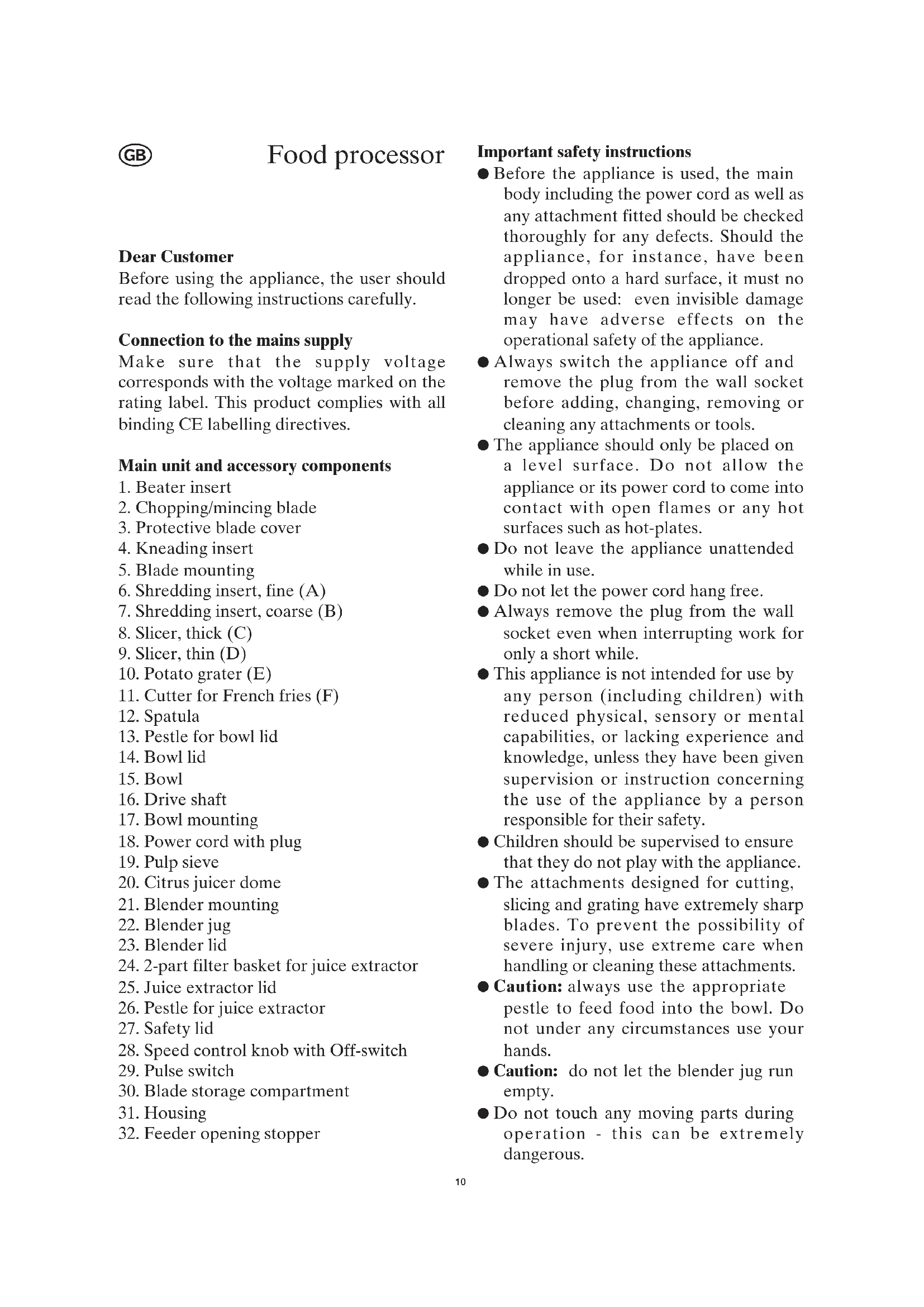 Important safety instructions ● Before the appliance is used, the main body including the power cord as well as any attachment fitted should be checked thoroughly for any defects. Should the appliance, for instance, have been dropped onto a hard surface, it must no longer be used: even invisible damage may have adverse effects on the operational safety of the appliance. ● Always switch the appliance off and remove the plug from the wall socket before adding, changing, removing or cleaning any attachments or tools. ● The appliance should only be placed on a level surface. Do not allow the appliance or its power cord to come into contact with open flames or any hot surfaces such as hot-plates. ● Do not leave the appliance unattended while in use. ● Do not let the power cord hang free. ● Always remove the plug from the wall socket even when interrupting work for only a short while. ● This appliance is not intended for use by any person (including children) with reduced physical, sensory or mental capabilities, or lacking experience and knowledge, unless they have been given supervision or instruction concerning the use of the appliance by a person responsible for their safety. ● Children should be supervised to ensure that they do not play with the appliance. ● The attachments designed for cutting, slicing and grating have extremely sharp blades. To prevent the possibility of severe injury, use extreme care when handling or cleaning these attachments. ● Caution: always use the appropriate pestle to feed food into the bowl. Do not under any circumstances use your hands. ● Caution: do not let the blender jug run empty. ● Do not touch any moving parts during operation - this can be extremely dangerous.
