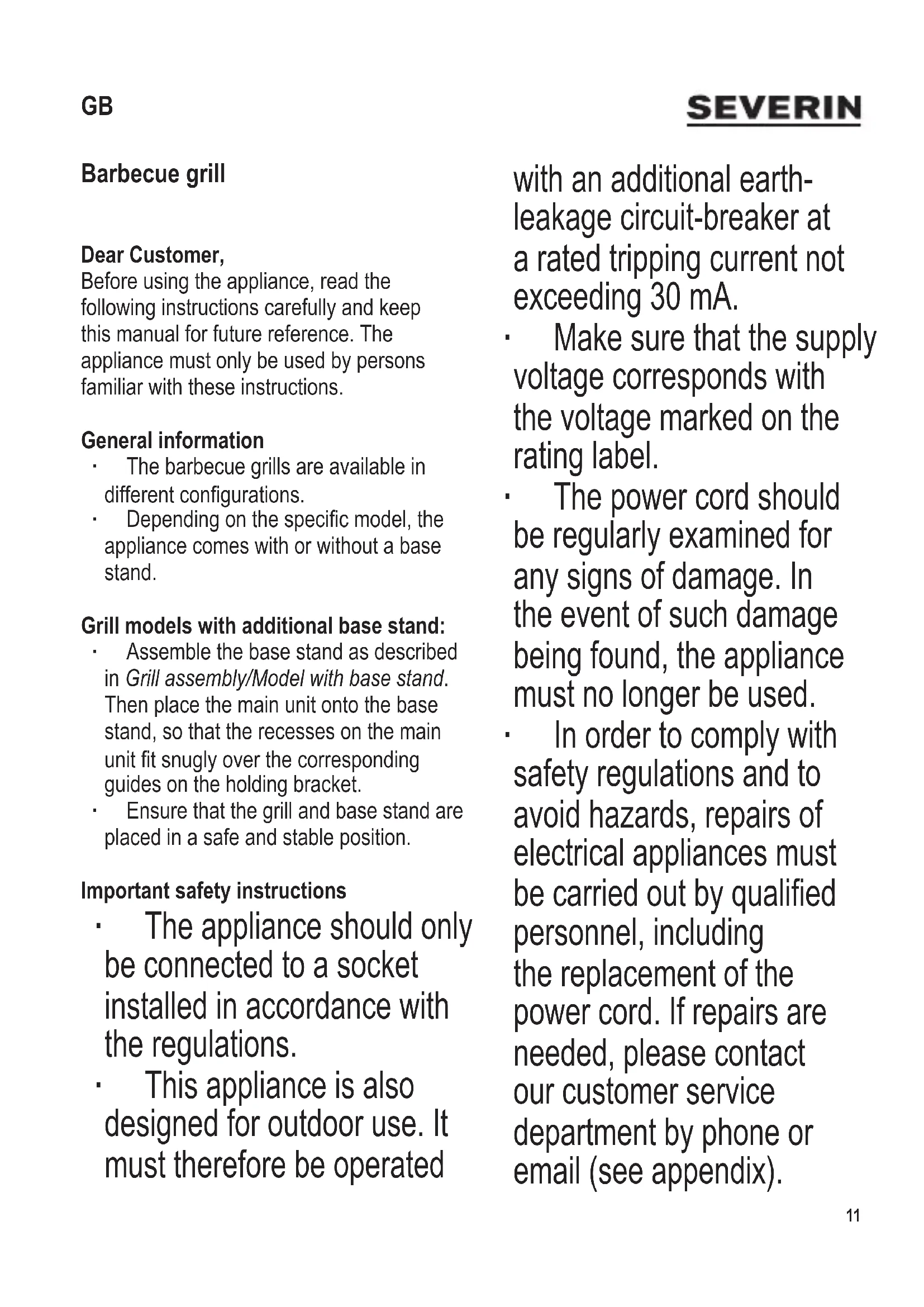 Barbecue grill Dear Customer, Before using the appliance, read the following instructions carefully and keep this manual for future reference. The appliance must only be used by persons familiar with these instructions. General information ∙ The barbecue grills are available in different congurations. ∙ Depending on the specic model, the appliance comes with or without a base stand. Grill models with additional base stand: ∙ Assemble the base stand as described in Grill assembly/Model with base stand. Then place the main unit onto the base stand, so that the recesses on the main unit t snugly over the corresponding guides on the holding bracket. ∙ Ensure that the grill and base stand are placed in a safe and stable position. Important safety instructions ∙ The appliance should only be connected to a socket installed in accordance with the regulations. ∙ This appliance is also designed for outdoor use. It must therefore be operated with an additional earth- leakage circuit-breaker at a rated tripping current not exceeding 30 mA. ∙ Make sure that the supply voltage corresponds with the voltage marked on the rating label. ∙ The power cord should be regularly examined for any signs of damage. In the event of such damage being found, the appliance must no longer be used. ∙ In order to comply with safety regulations and to avoid hazards, repairs of electrical appliances must be carried out by qualied personnel, including the replacement of the power cord. If repairs are needed, please contact our customer service department by phone or email (see appendix). GB12 104 x 142 mm ∙ The appliance is not intended to be operated by means of an external timer or separate remote-control system. ∙ Caution: Do not, under any circumstances, use charcoal or any other solid or liquid fuel to operate the grill. ∙ Do not put liquids in the grill.