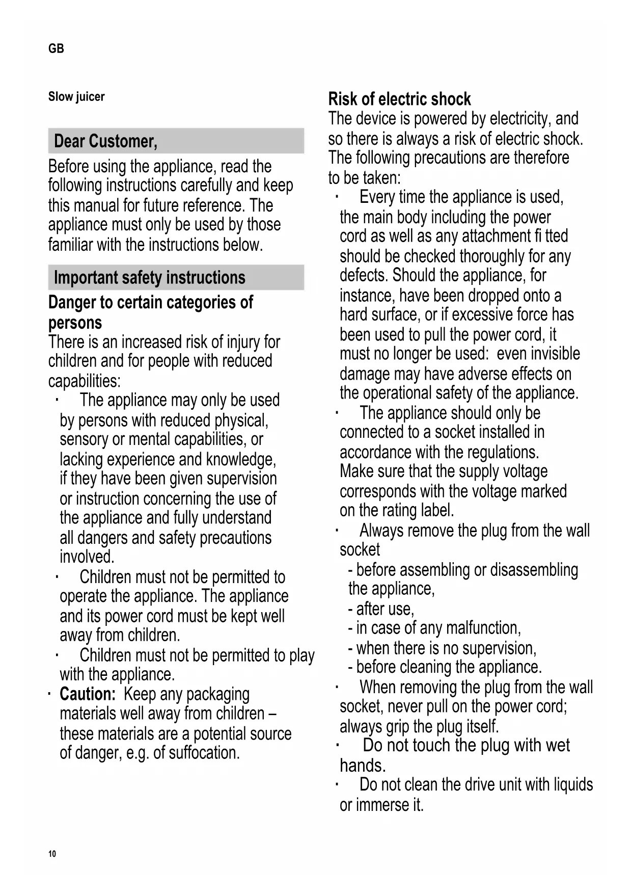 ∙ Do not try to extract juice from hot food items. ∙ Use only original accessory parts with this appliance. Proper use ∙ This appliance must only be used for extracting juice from vegetables and fruit and for preparing sorbets from deep-frozen fruit or vegetables. It is also suitable for making fruit purées (compotes) for jams or sauces. ∙ Caution: The appliance is not designed to process hard food items such as nuts or ice cubes. ∙ Any use other than that described in these instructions must be considered improper and may lead to personal injury or material damage. ∙ This appliance is intended for domestic or similar applications, such as - in staff kitchens in shops, offi ces and other similar working environments, - in agricultural working environments, - by customers in hotels, motels etc. and similar accommodation, - in bed-and breakfast type environments. ∙ Do not leave the appliance unattended while connected. ∙ Caution: Any misuse can cause severe personal injury.12 In case of a defective appliance A defective appliance can cause material damage and injury