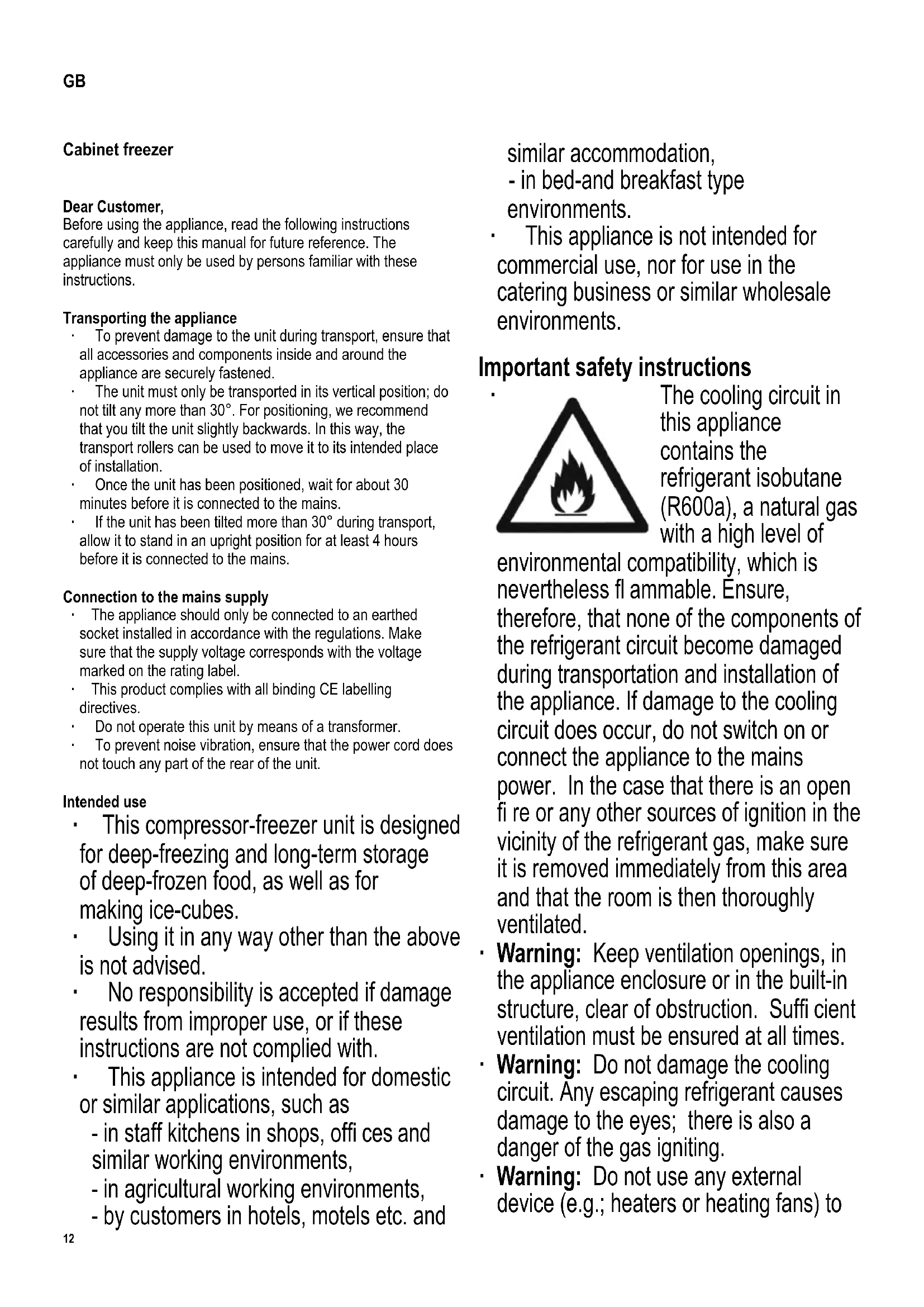 - Gemäß Verordnung (EU) Nr. 1060/2010 Anhang III ** Der tatsächliche Verbrauch hängt von der Nutzung und vom Standort des Gerätes ab12 Cabinet freezer Dear Customer, Before using the appliance, read the following instructions carefully and keep this manual for future reference. The appliance must only be used by persons familiar with these instructions. Transporting the appliance ∙ To prevent damage to the unit during transport, ensure that all accessories and components inside and around the appliance are securely fastened. ∙ The unit must only be transported in its vertical position; do not tilt any more than 30°. For positioning, we recommend that you tilt the unit slightly backwards. In this way, the transport rollers can be used to move it to its intended place of installation. ∙ Once the unit has been positioned, wait for about 30 minutes before it is connected to the mains. ∙ If the unit has been tilted more than 30° during transport, allow it to stand in an upright position for at least 4 hours before it is connected to the mains. Connection to the mains supply ∙ The appliance should only be connected to an earthed socket installed in accordance with the regulations. Make sure that the supply voltage corresponds with the voltage marked on the rating label. ∙ This product complies with all binding CE labelling directives. ∙ Do not operate this unit by means of a transformer. ∙ To prevent noise vibration, ensure that the power cord does not touch any part of the rear of the unit. Intended use ∙ This compressor-freezer unit is designed for deep-freezing and long-term storage of deep-frozen food, as well as for making ice-cubes. ∙ Using it in any way other than the above is not advised. ∙ No responsibility is accepted if damage results from improper use, or if these instructions are not complied with. ∙ This appliance is intended for domestic or similar applications, such as - in staff kitchens in shops, offi ces and similar working environments, - in agricultural working environments, - by customers in hotels, motels etc. and similar accommodation, - in bed-and breakfast type environments. ∙ This appliance is not intended for commercial use, nor for use in the catering business or similar wholesale environments. Important safety instructions