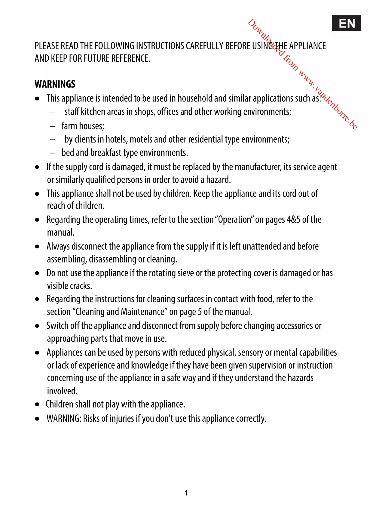 Downloaded from www.vandenborre.bePLEASE READ THE FOLLOWING INSTRUCTIONS CAREFULLY BEFORE USING THE APPLIANCE AND KEEP FOR FUTURE REFERENCE. WARNINGS This appliance is intended to be used in household and similar applications such as: staff kitchen areas in shops, offices and other working environments; farm houses; by clients in hotels, motels and other residential type environments; bed and breakfast type environments. If the supply cord is damaged, it must be replaced by the manufacturer, its service agent or similarly qualified persons in order to avoid a hazard. This appliance shall not be used by children. Keep the appliance and its cord out of reach of children. Regarding the operating times, refer to the section “Operation” on pages 4&5 of the manual. Always disconnect the appliance from the supply if it is left unattended and before assembling, disassembling or cleaning. Do not use the appliance if the rotating sieve or the protecting cover is damaged or has visible cracks. Regarding the instructions for cleaning surfaces in contact with food, refer to the section “Cleaning and Maintenance” on page 5 of the manual. Switch off the appliance and disconnect from supply before changing accessories or approaching parts that move in use. Appliances can be used by persons with reduced physical, sensory or mental capabilities or lack of experience and knowledge if they have been given supervision or instruction concerning use of the appliance in a safe way and if they understand the hazards involved. Children shall not play with the appliance.