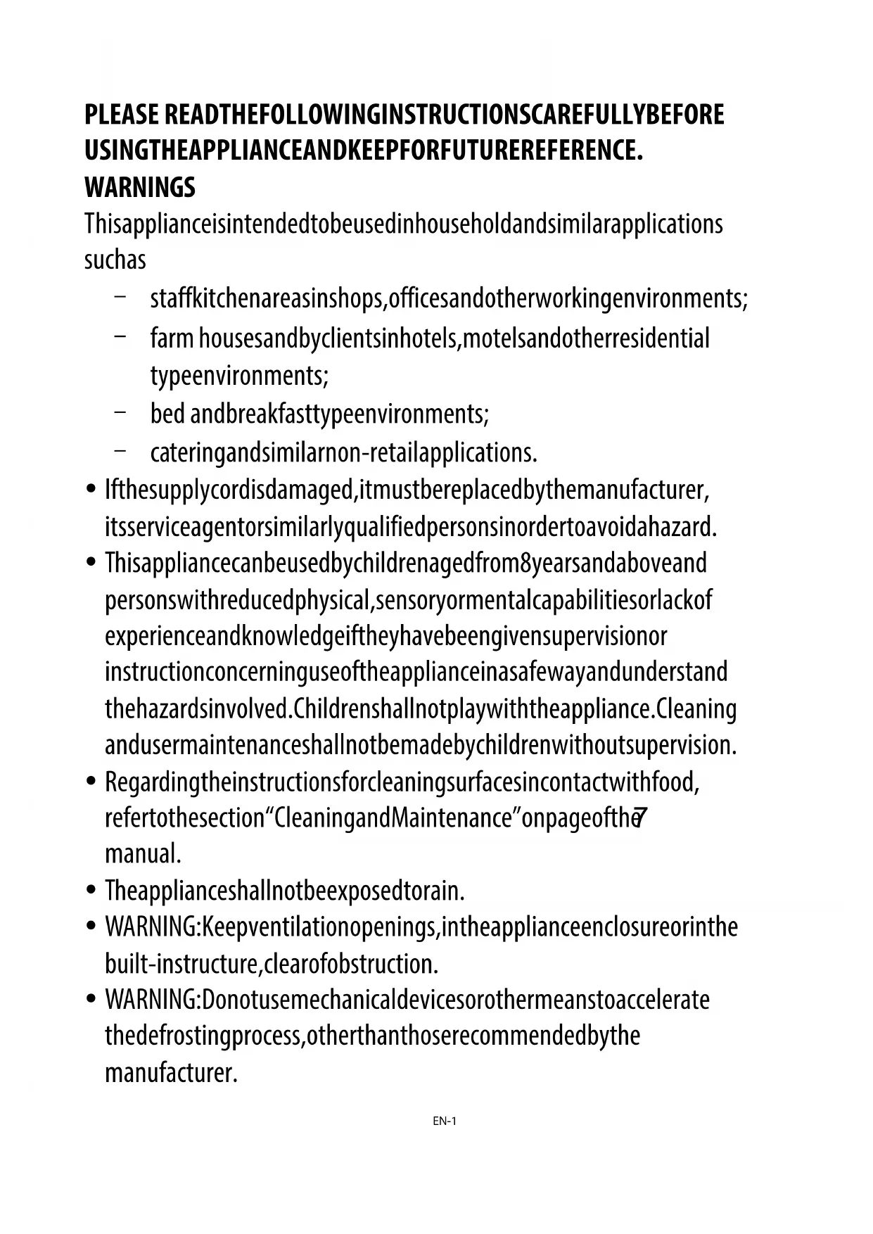 ARNING: Do not use mechanical devices or other means to accelerate the defrosting process, other than those recommended by the manufacturer. 7EN-2