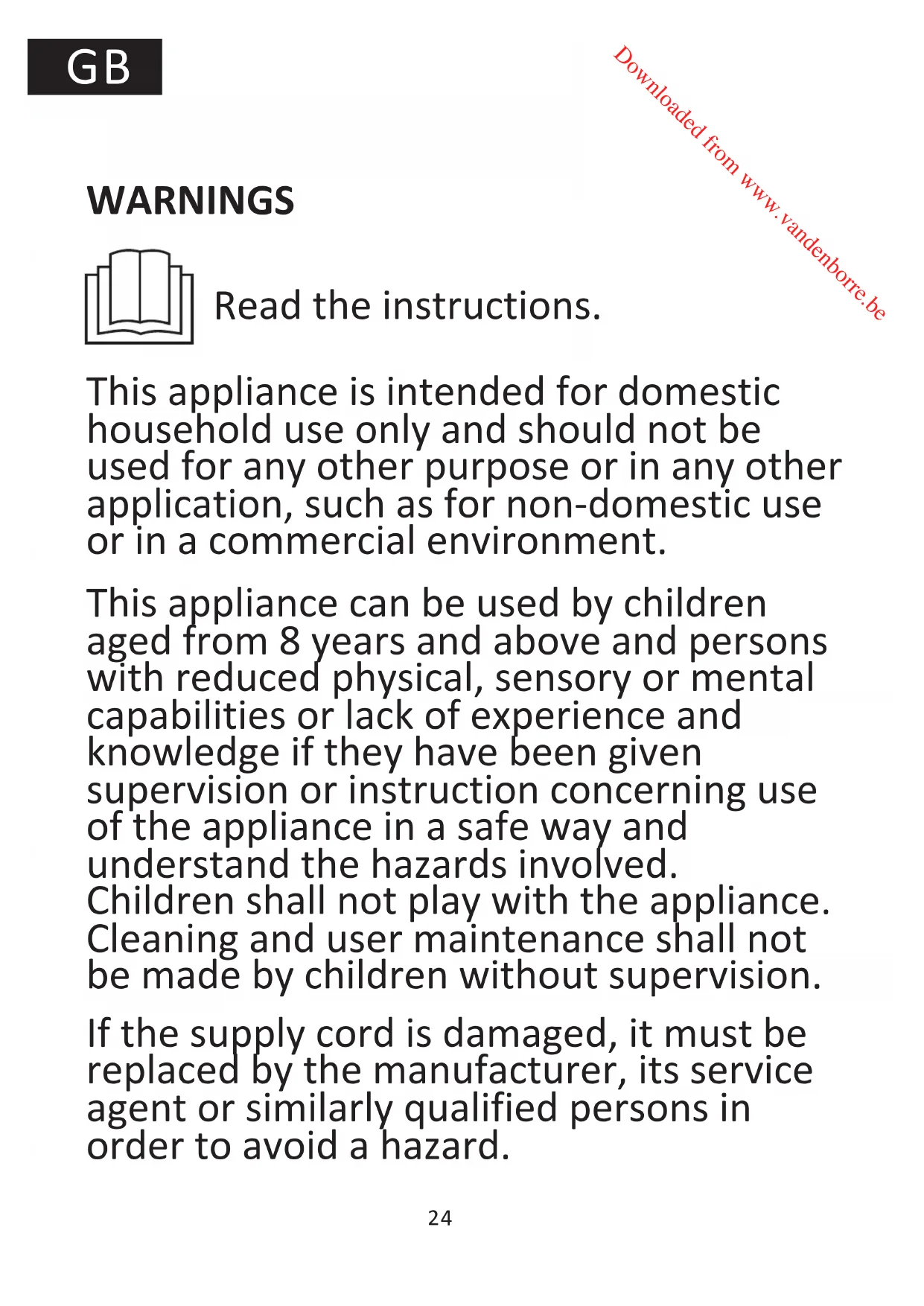 Downloaded from www.vandenborre.beGB WARNINGS Read the instructions. This appliance is intended for domestic household use only and should not be used for any other purpose or in any other application, such as for non-domestic use or in a commercial environment. This appliance can be used by children aged from 8 years and above and persons with reduced physical, sensory or mental capabilities or lack of experience and knowledge if they have been given supervision or instruction concerning use of the appliance in a safe way and understand the hazards involved. Children shall not play with the appliance. Cleaning and user maintenance shall not be made by children without supervision. If the supply cord is damaged, it must be replaced by the manufacturer, its service agent or similarly qualified persons in order to avoid a hazard.