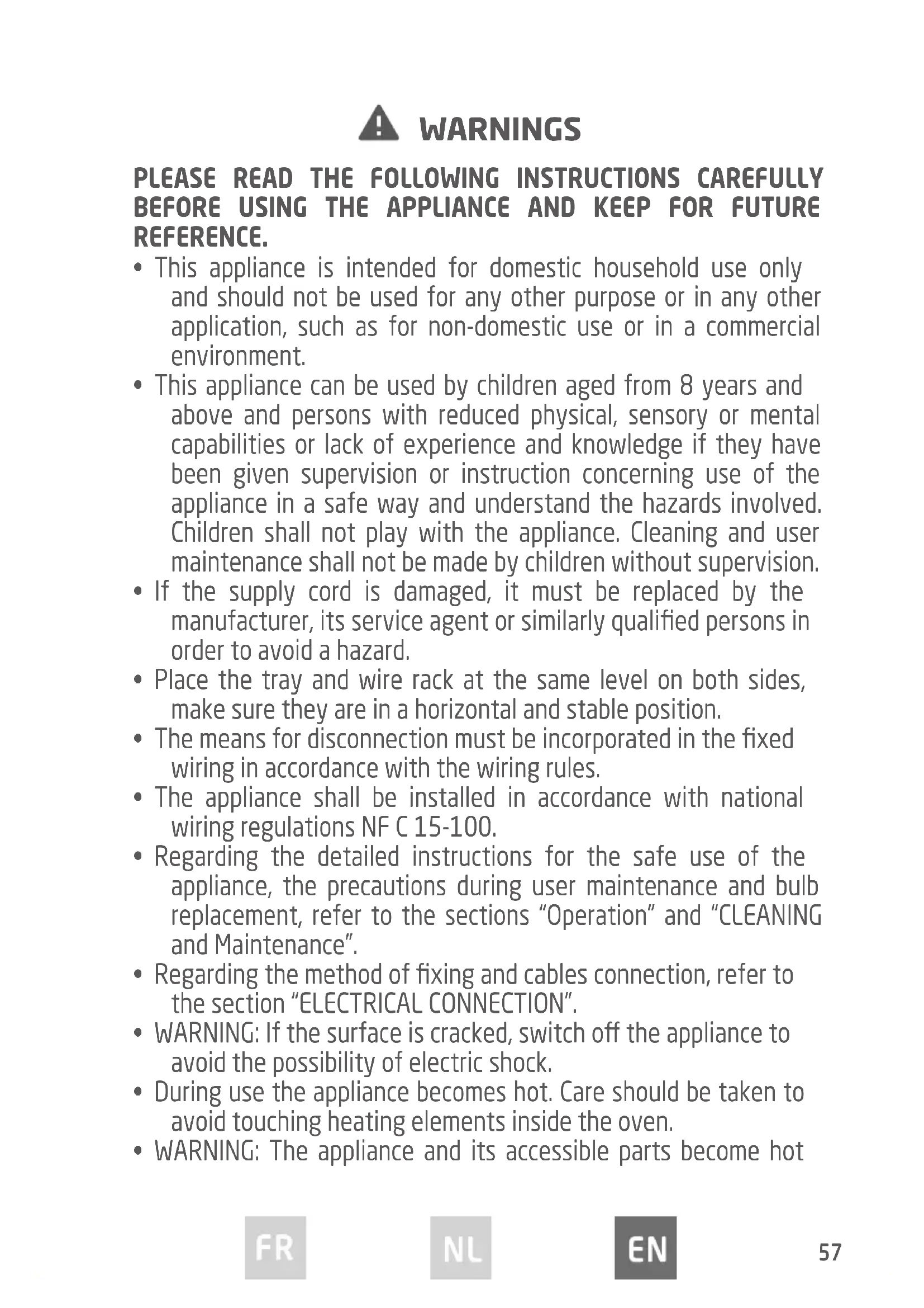 - WARNING: The appliance and its accessible parts become hot WARNINGS58 during use. Care should be taken to avoid touching heating elements. Children less than 8 years of age shall be kept away unless continuously supervised.
