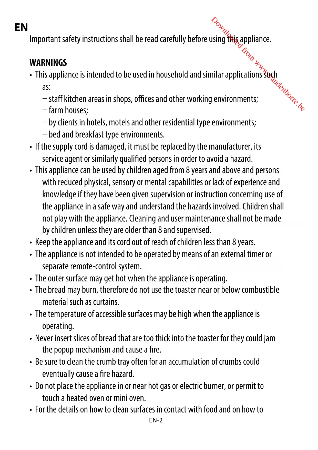 Unplug the appliance and allow it to cool completely before cleaning. Clean the outside of the appliance with a damp cloth. Dry thoroughly. Do not use abrasive or chemical cleaning agents. Surfaces in contact with food should be cleaned regularly to avoid cross contamination from dierent types of food, the use of a dry cloth is advisable when dealing with surfaces that come into contact with food. Correct food hygiene practices should always be followed at all times to avoid possibility of food poisoning /cross contamination. To remove crumbs, slide out the crumb tray located at the bottom of the appliance and empty it. Wipe clean. Make sure the crumb tray is tted correctly before using the appliance again. To remove any pieces of bread remaining in the toaster, turn the toaster upside down and gently shake. SPECIFICATIONS Ratings: 220-240V~ 50/60Hz 870-1030W Downloaded from www.vandenborre.beEN-6
