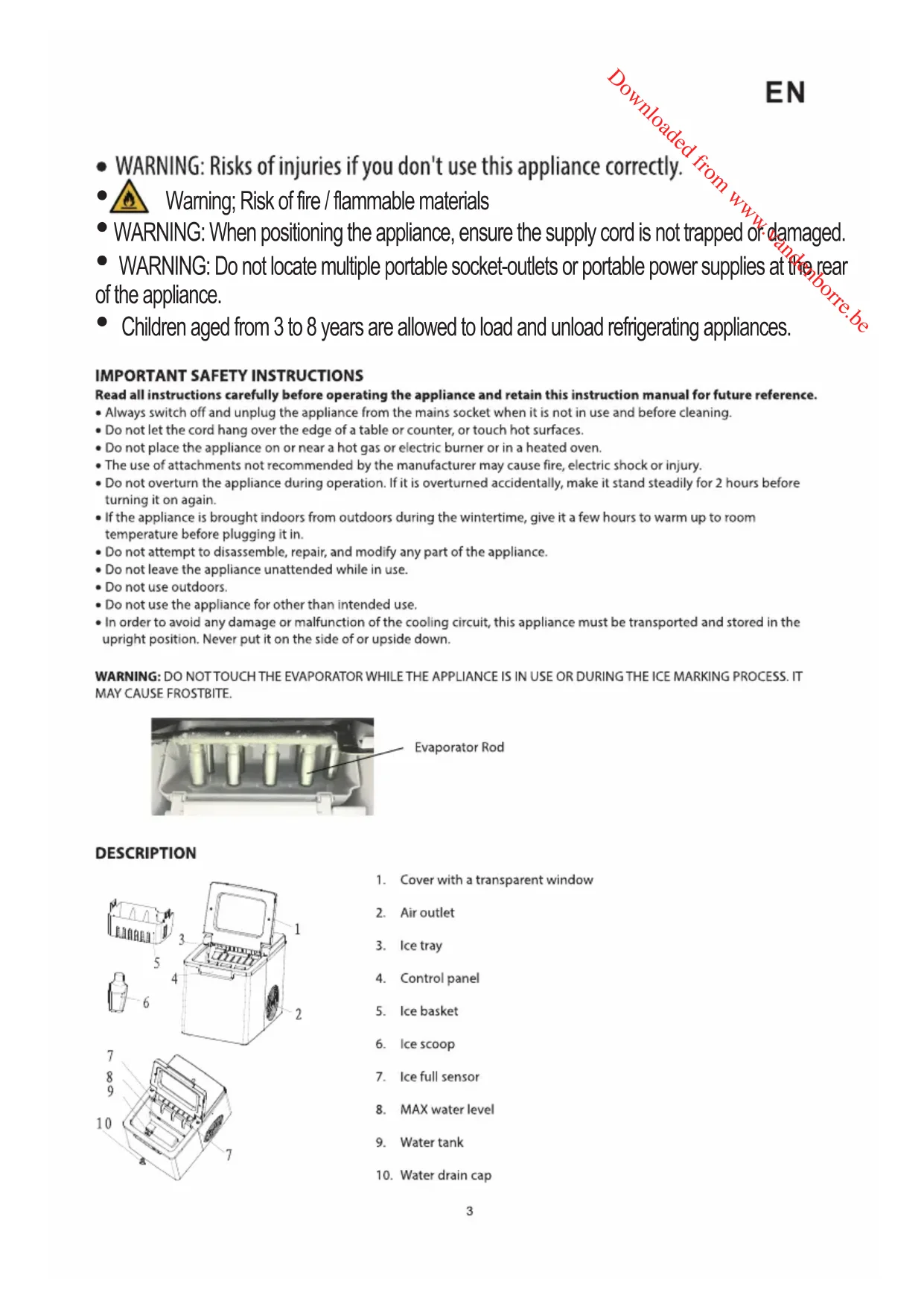 Children aged from 3 to 8 years are allowed to load and unload refrigerating appliances. Downloaded from www.vandenborre.be4 Control Panel Buttons: Power ON/OFF Selecting ice cube size Indicator lights: Power adding water Ice full Small ice cube Large ice cube