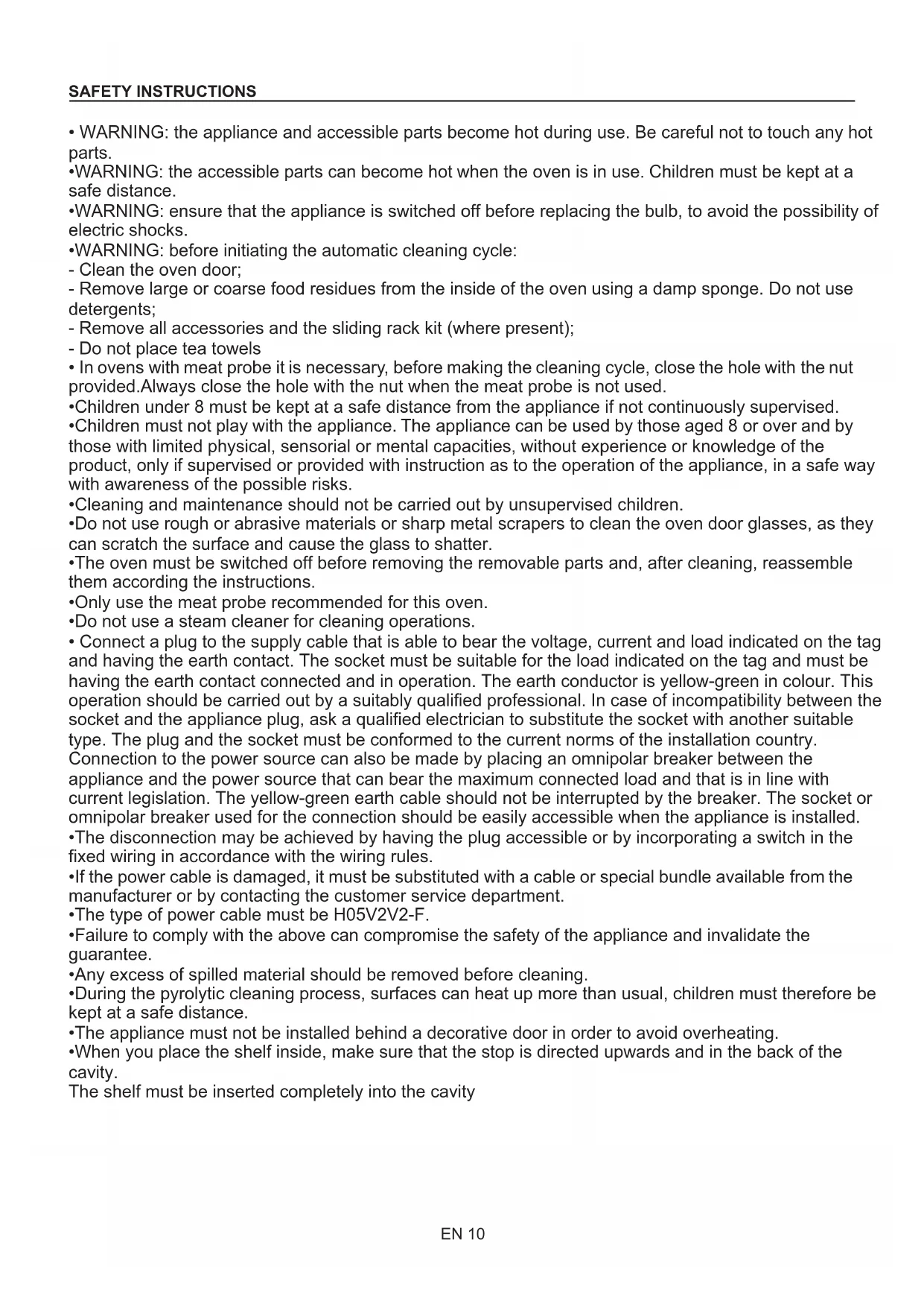 Plug into the power supply. Ensure first that there is a third contact that acts as earthing for the oven. The oven must be properly earthed. If the model of oven is not fitted with a plug, fit a standard plug to the power cable. It must be able to bear the power supply indicated on the specifications plate. The earthing cable is yellowgreen. The plug must be fitted by a properly qualified person. If the socket and the plug are incompatible the socket must be changed by a properly qualified person.A properly qualified person must also ensure that the power cables can carry the current required to operate the oven. An ON/OFF switch may also be connected to the power supply. The connections must take account of the current supplied and must comply with current legal requirements. The yellow-green earthing cable must not be governed by the ON/OFF switch. The socket or the ON/OFF switch used for connecting to the power supply must be easily accessible when the oven has been installed. Important: During installation, position the power cable in such a way that it will not be subjected to temperatures of above 50°C at any point. The oven complies with safety standards set by the regulatory bodies. The oven is safe to use only if it has been adequately earthed in compliance with current legal requirements on wiring safety. You must ensure that the oven has been adequately earthed. The manufacturers cannot be held responsible for any harm or injury to persons, animals or belongings caused by failure to properly earth the oven.