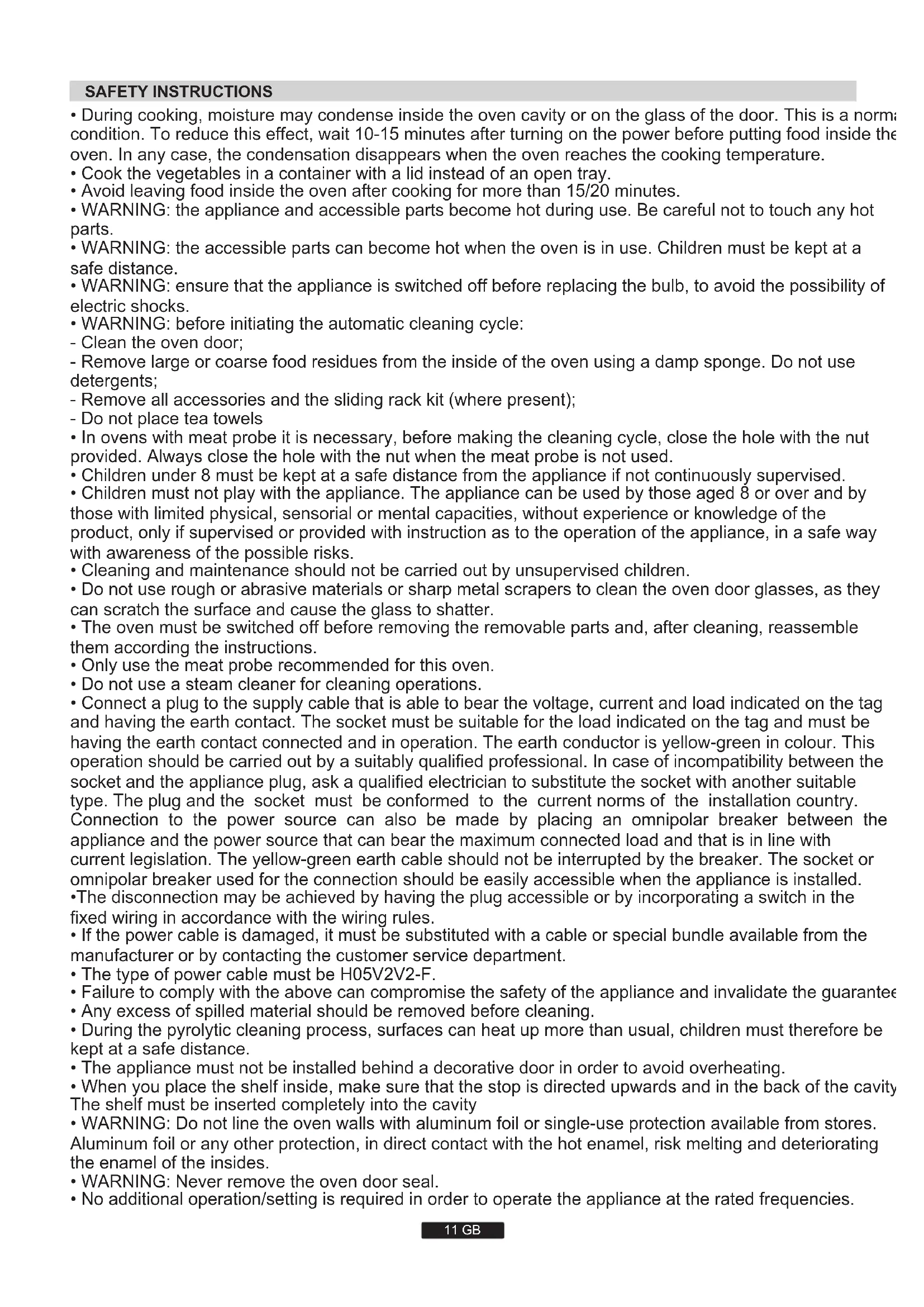 THE ELECTRICAL CONNECTION SHOULD BE CARRIED OUT BY AN APPROVED CONTRACTOR OR TECHNICIAN WITH SIMILAR QUALIFICATIONS. The installation receiving the appliance must comply with the standard in force in the installation country. The manufacturer does not accept any responsibility if this provision is not complied with. Connection to the network must be by earthed socket outlet, or by means of a multipole circuit-breaker, in compliance with the installation country. The installation must be protected by suitable fuses, and have wires with a large enough cross-section to supply the oven normally. CONNECTION: The oven is fitted with a power lead for connecting exclusively to a voltage of 220-240 V AC across the phases or across phase and neutral. Connection must be carried out having first checked: -the supply voltage indicated on the meter, The lead protection wire (green/yellow) connected to the earth terminal of the oven must be connected to the earth terminal of the installation. Caution: