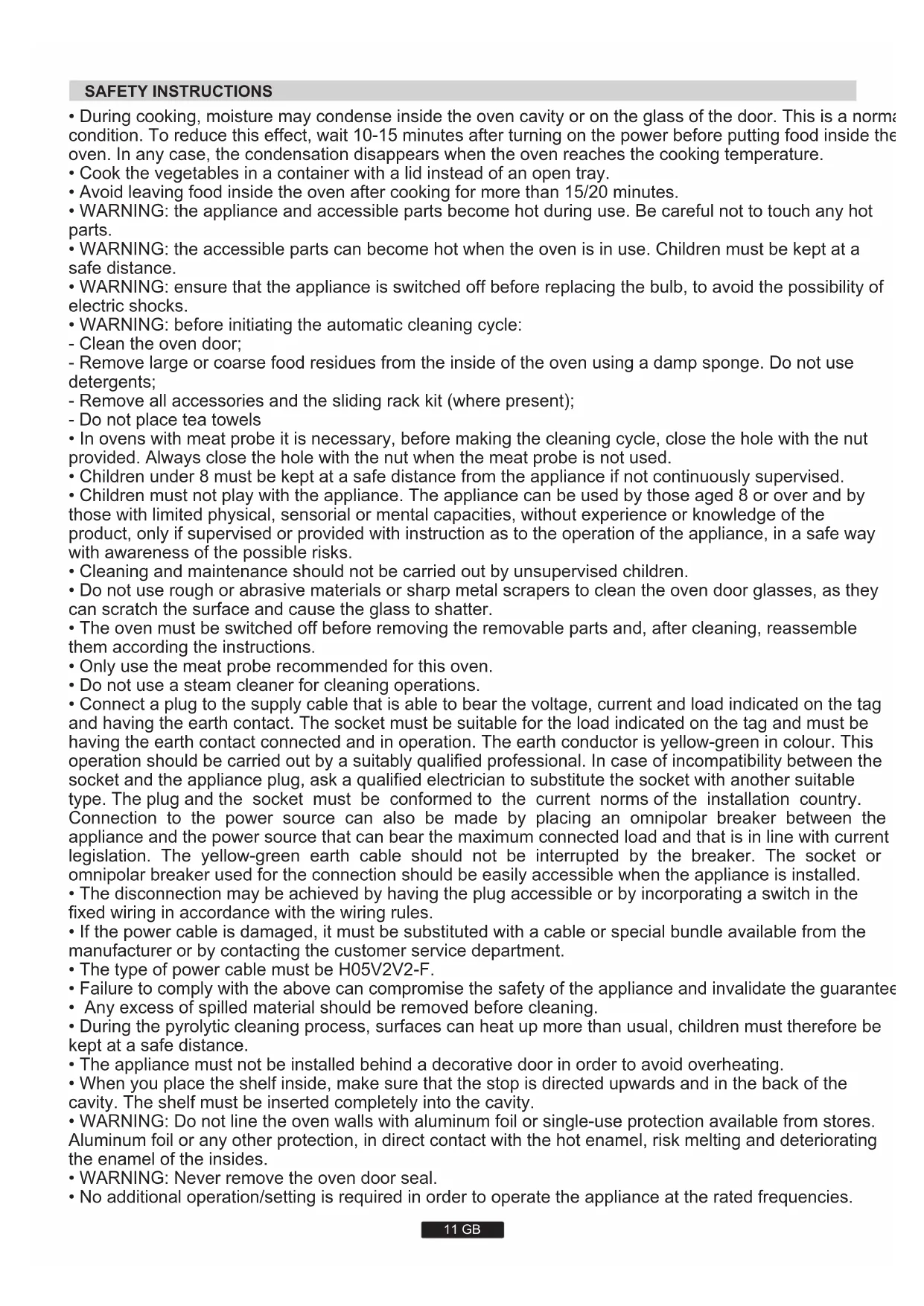 - If the cable is damaged it must be replaced promptly. When replacing the cable, follow these instructions. Remove the power cable and replace it with one of the H05VV-F type. The cable must be able to bear the electrical current required by the oven.Cable replacement must be carried out by properly qualified technicians. The earthing cable (yellow-green) must be 10 mm longer than the power cable. Use only an approved service centre for repairs and ensure that only original parts are used. If the above instructions are not adhered to the manufacturers cannot guarantee the safety of the oven.