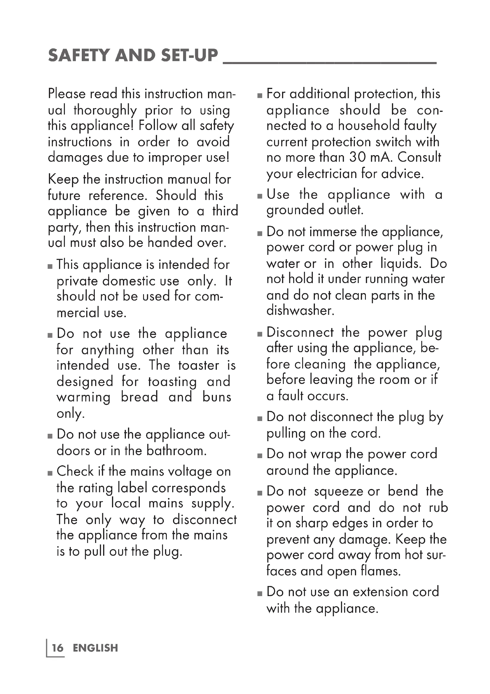 Do not use the appliance for anything other than its intended use. The toaster is designed for toasting and warming bread and buns only.