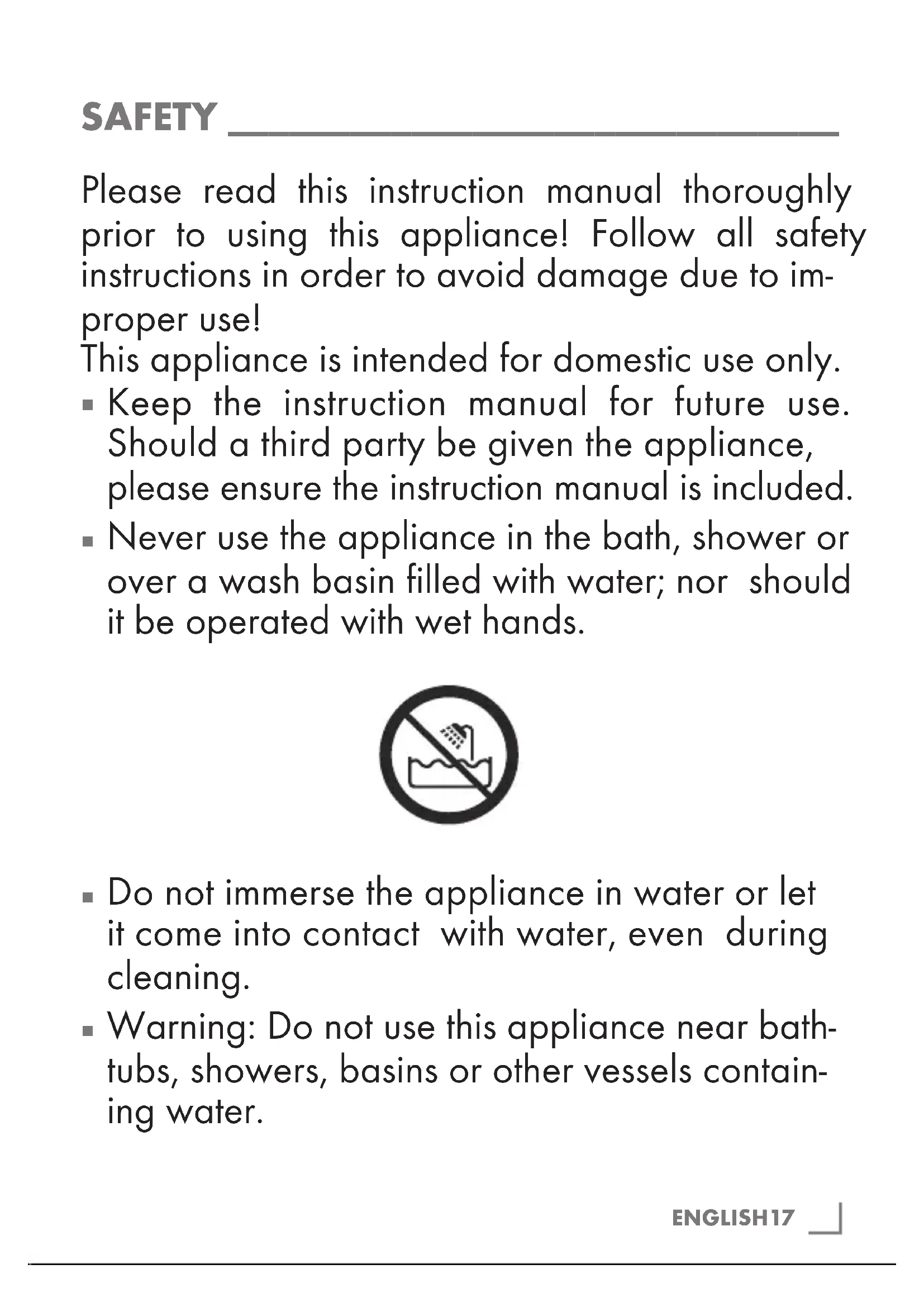 Never use the appliance in the bath, shower or over a wash basin filled with water; nor should it be operated with wet hands.