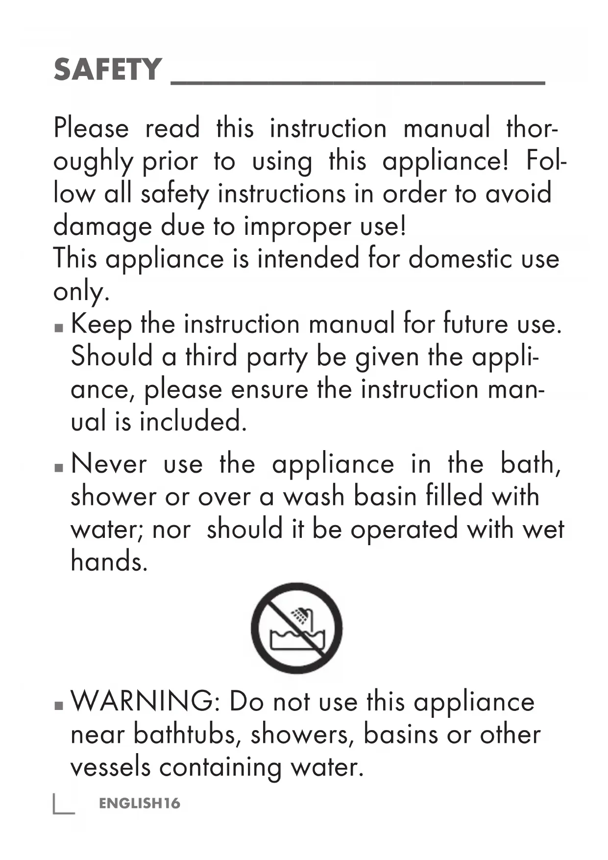 Never use the appliance in the bath, shower or over a wash basin filled with water; nor should it be operated with wet hands.