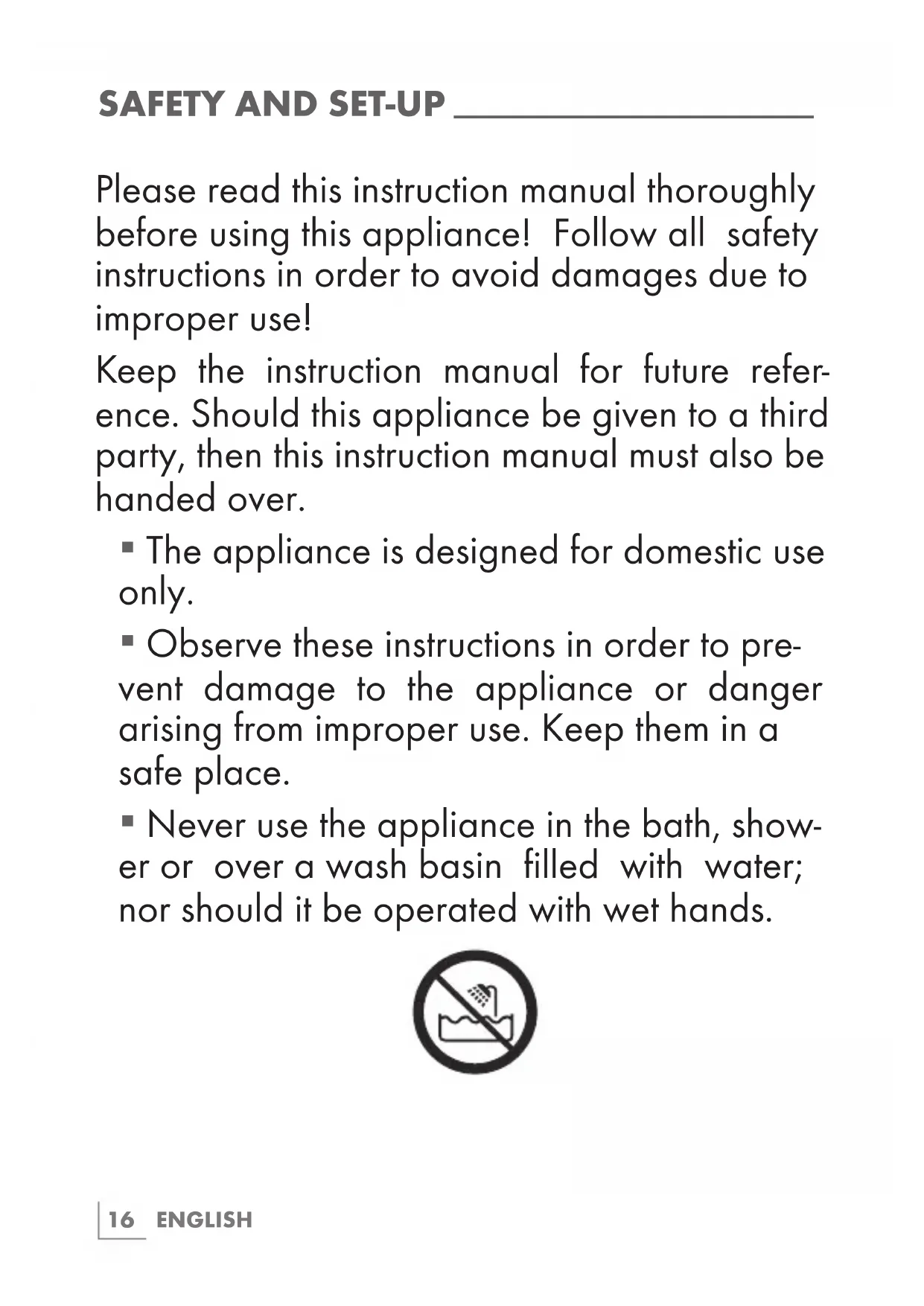 - Never use the appliance in the bath, show- er or over a wash basin filled with water; nor should it be operated with wet hands.ENGLISH