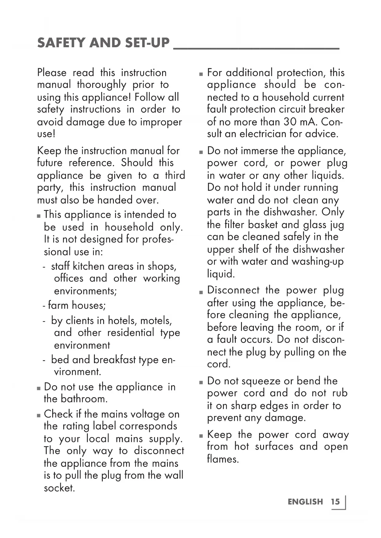 Do not immerse the appliance, power cord, or power plug in water or any other liquids. Do not hold it under running water and do not clean any parts in the dishwasher. Only the filter basket and glass jug can be cleaned safely in the upper shelf of the dishwasher or with water and washing-up liquid.