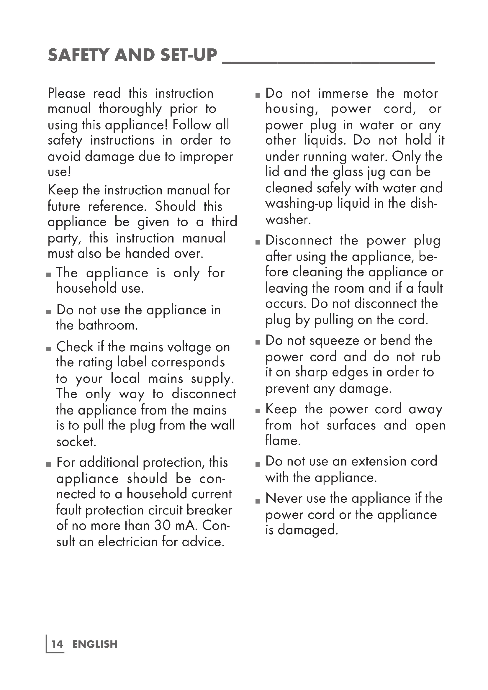Do not immerse the motor housing, power cord, or power plug in water or any other liquids. Do not hold it under running water. Only the lid and the glass jug can be cleaned safely with water and washing-up liquid in the dish- washer.
