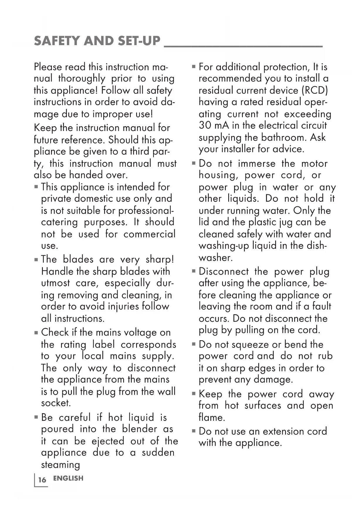 Do not immerse the motor housing, power cord, or power plug in water or any other liquids. Do not hold it under running water. Only the lid and the plastic jug can be cleaned safely with water and washing-up liquid in the dish- washer.