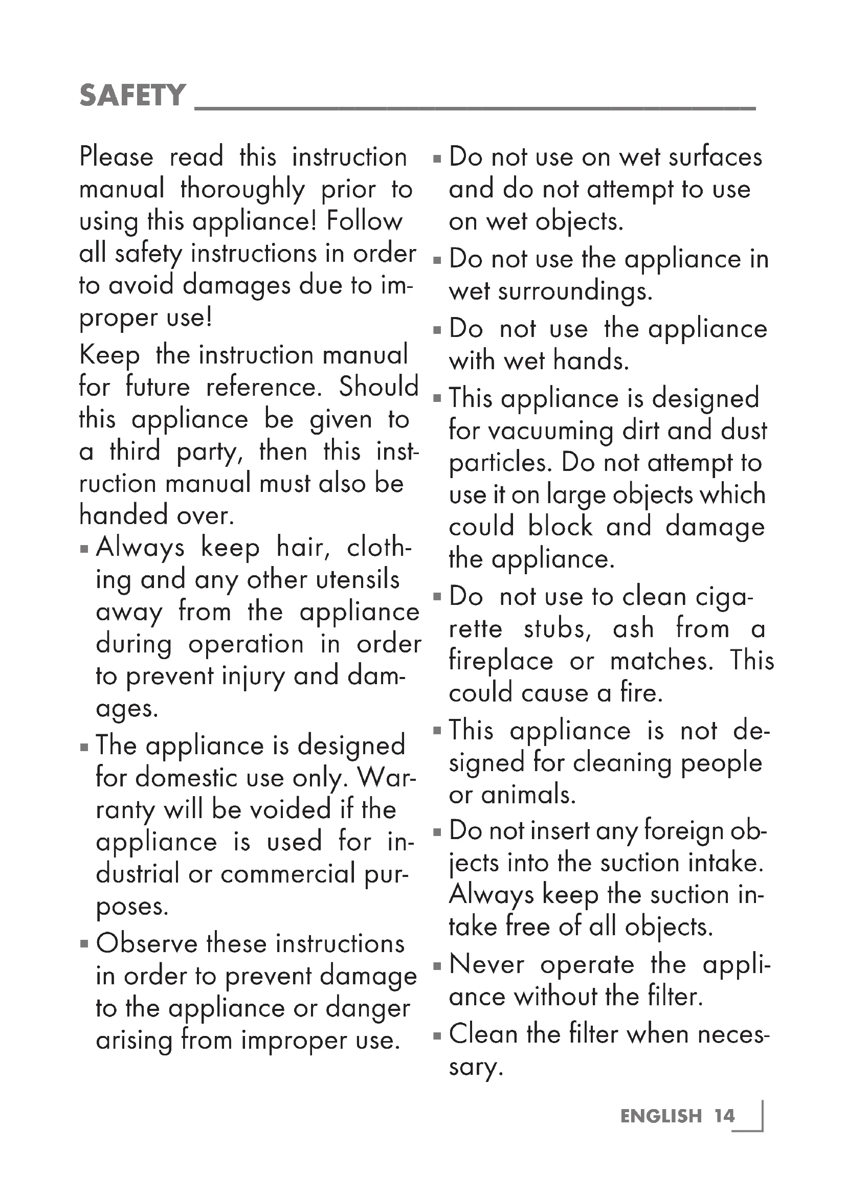 This appliance is designed for vacuuming dirt and dust particles. Do not attempt to use it on large objects which could block and damage the appliance.