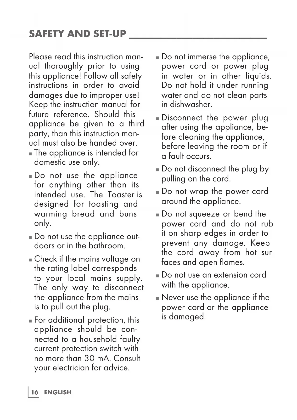 When using for the first time, smoke can develop due to production residues. However, this does not mean the appli- ance is defective. The first time you switch it on, use the appli- ance as you normally would, but without bread. Ensure for proper room ventilation.19 ENGLISH