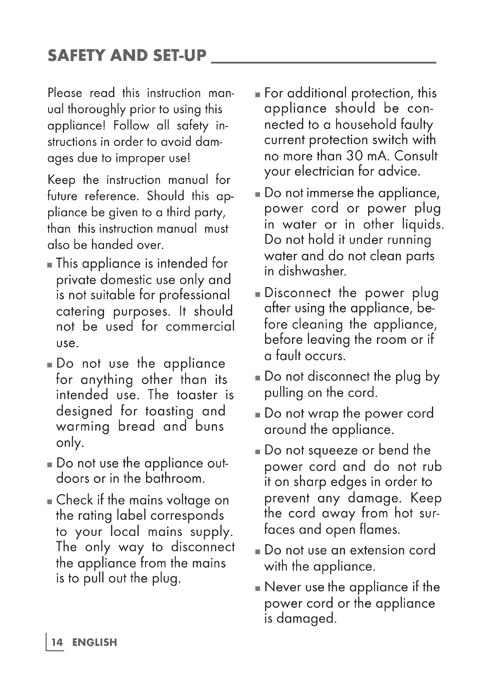 The bread can catch fire be- cause of overheating. Never use the appliance in or near to combustible, inflammable places, materials and furni- ture. Do not let the appliance come into contact with or be- come covered by inflammable materials such as curtains, tex- tiles, walls, etc.16 ENGLISH