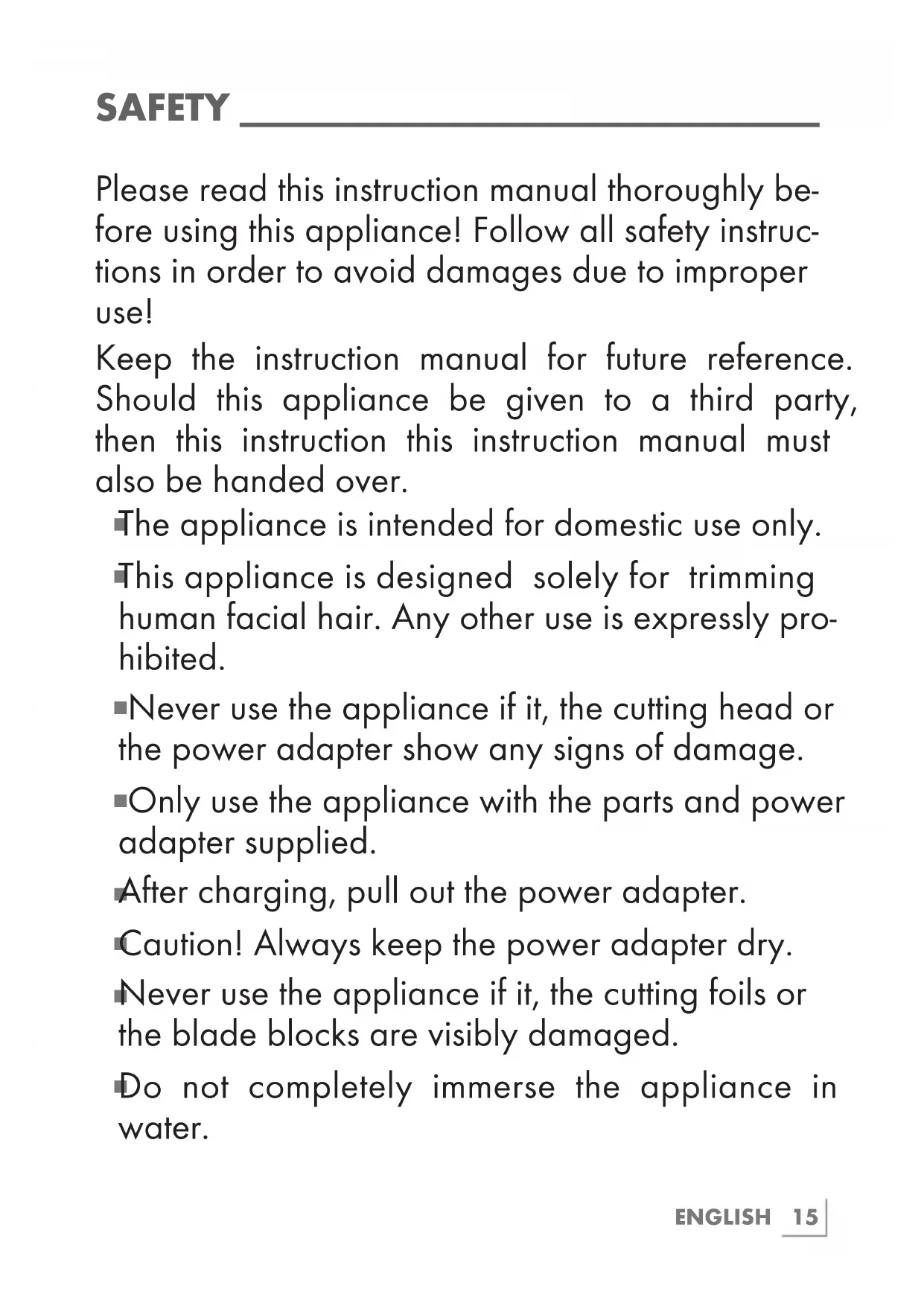 SAFETY _____________________________ Please read this instruction manual thoroughly be- fore using this appliance! Follow all safety instruc- tions in order to avoid damages due to improper use! Keep the instruction manual for future reference. Should this appliance be given to a third party, then this instruction this instruction manual must also be handed over.