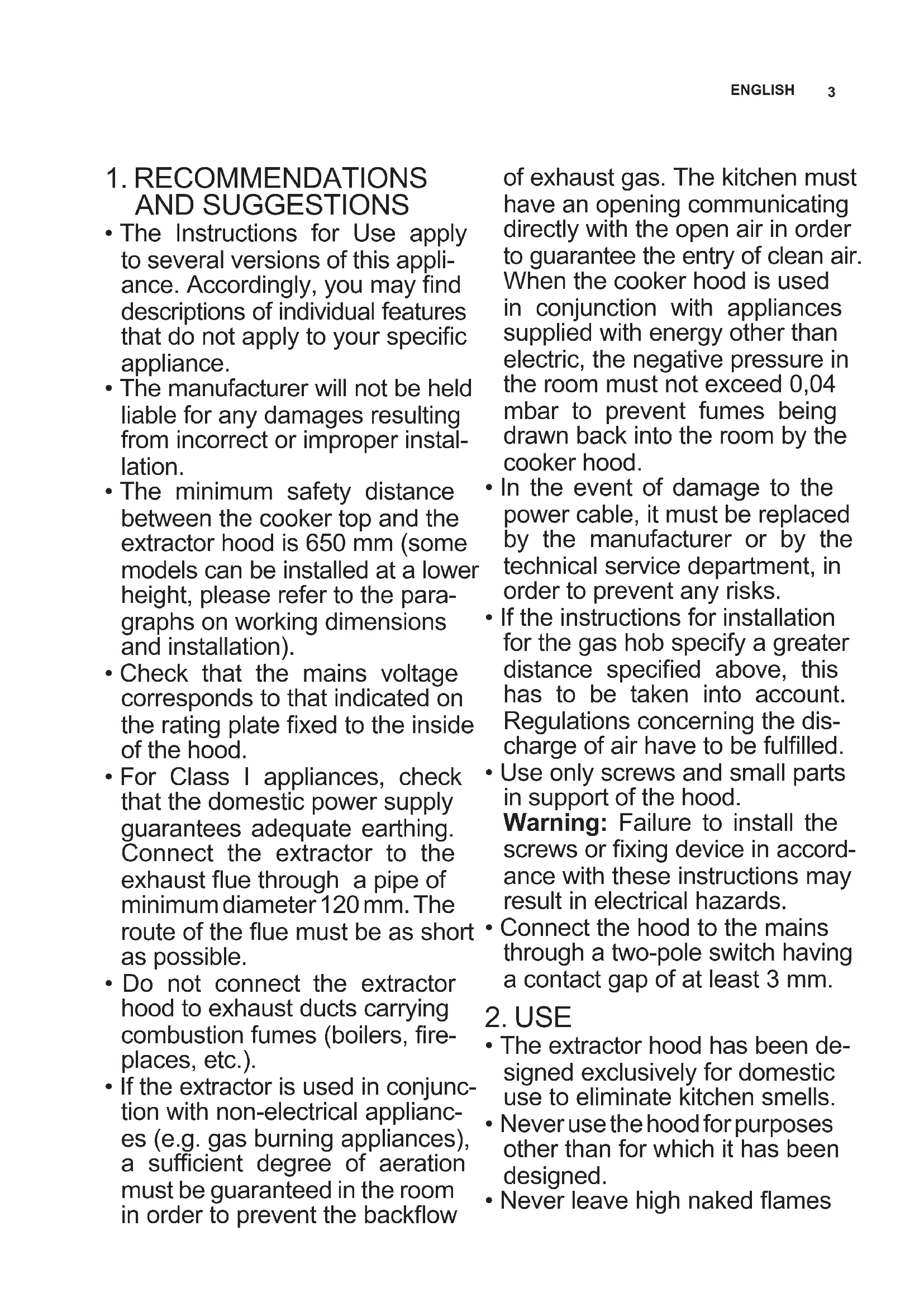 - If the extractor is used in conjunc- tion with non-electrical applianc- es (e.g. gas burning appliances), a sufcient degree of aeration must be guaranteed in the room in order to prevent the backow of exhaust gas. The kitchen must have an opening communicating directly with the open air in order to guarantee the entry of clean air. When the cooker hood is used in conjunction with appliances supplied with energy other than electric, the negative pressure in the room must not exceed 0,04 mbar to prevent fumes being drawn back into the room by the cooker hood.