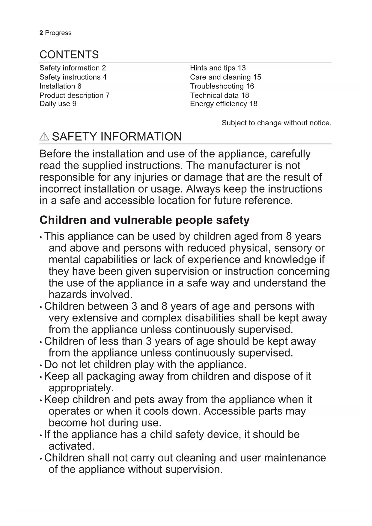 - Children shall not carry out cleaning and user maintenance of the appliance without supervision. 2 ProgressGeneral Safety